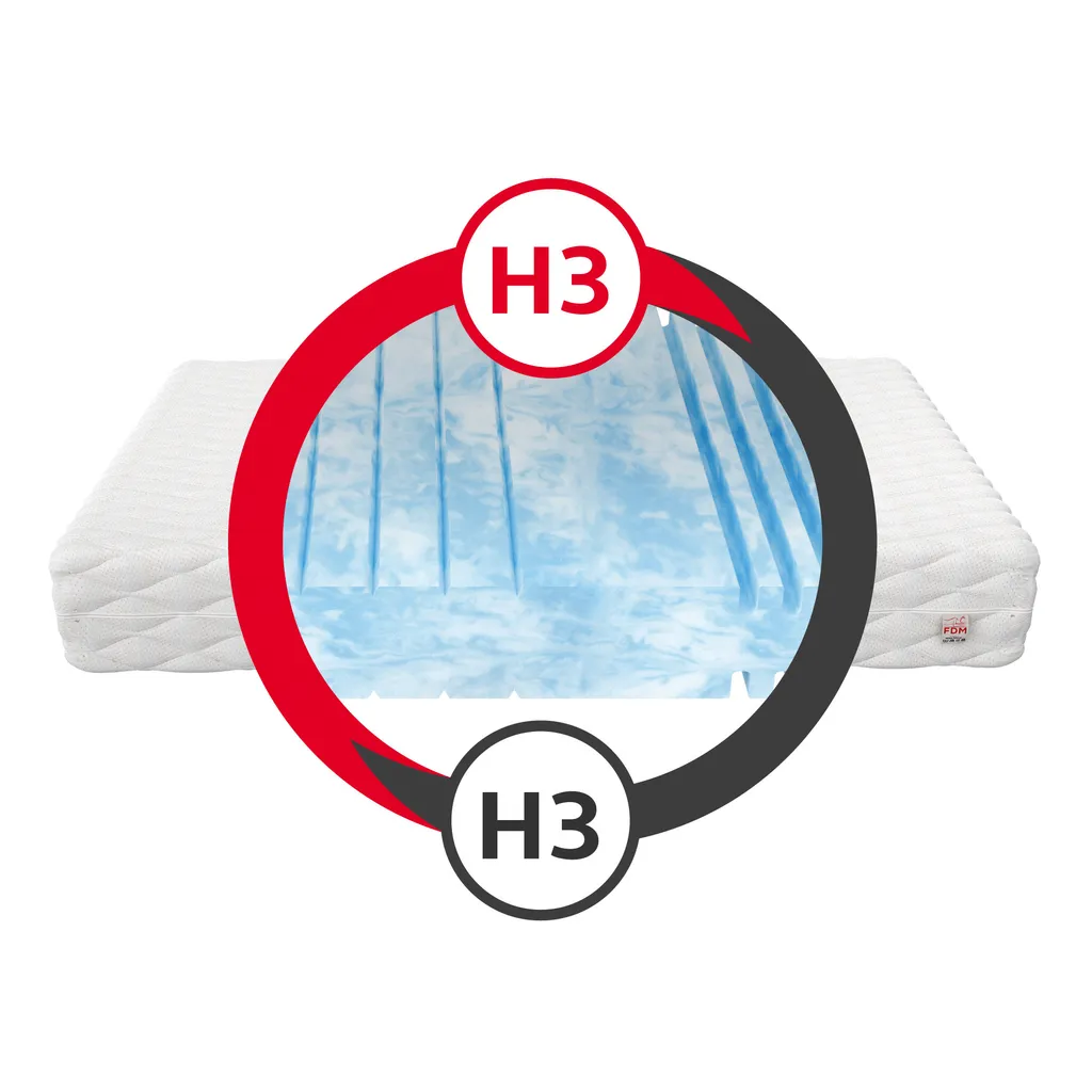 verformt sich nicht und ist sehr elastisch. Die besonderen Kanäle sorgen für gute Luftzirkulation und bieten hohen Schlafkomfort.