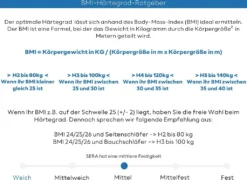Achtung: Liegen Sie zwischen 2 Härtgraden (BMI +/- 1-2), dann entscheiden Sie wie folgt: für weicheres Liegen oder wenn Sie Seitenschläfer sind, nehmen Sie den unteren Härtegrad, für festeres Liegen oder Bauchschläfer / Rückenschläfer, nehmen Sie den höheren Härtegrad!