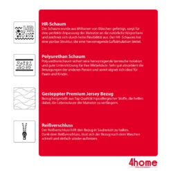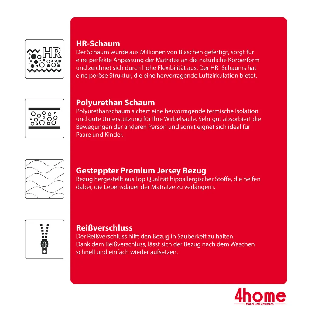 - HR-SCHAUM ist einer der am häufigsten verwendeten Schaumstoffe für Matratzen. Seine auf Millionen von Blasen basierende Struktur sorgt für Punktelastizität, was eine sehr gute Unterstützung der Wirbelsäule und aller Körperteile bedeutet. Er hat höheren Dichte als Polyurethan und nimmt seine ursprüngliche Form doppelt so schnell wieder an. Allergiker werden die Eigenschaften von hochelastischem Schaumstoff zu schätzen wissen.