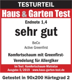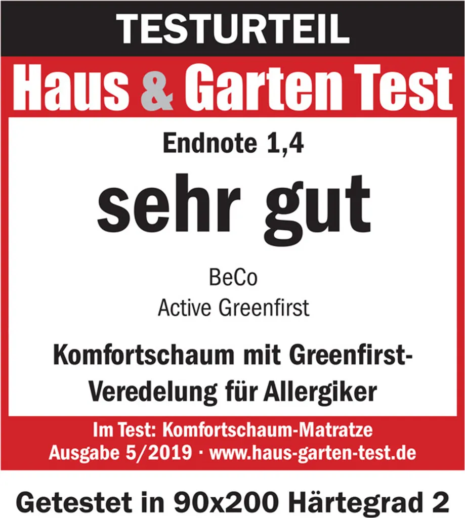 Testsiegel :*Testurteil „sehr gut“ Note 1,4 Haus & Garten Test, Ausgabe 5/2019, (Größe 90×200 cm Härte 2)