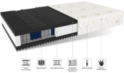 Die Matratze NOIR ist eine Wendematratze mit unterschiedlichen Härtegraden. Sie wurde speziell hergestellt, um der darauf schlafenden Person einen erholsamen Morgen zu bieten. Die Struktur besteht aus mehreren Schäumen sowie aus einem elastischen Federblock. Dadurch regeneriert sich der ganze Körper und der Schlafende nutzt die volle Zeit aus, um Kraft für den nächsten Tag zu tanken.