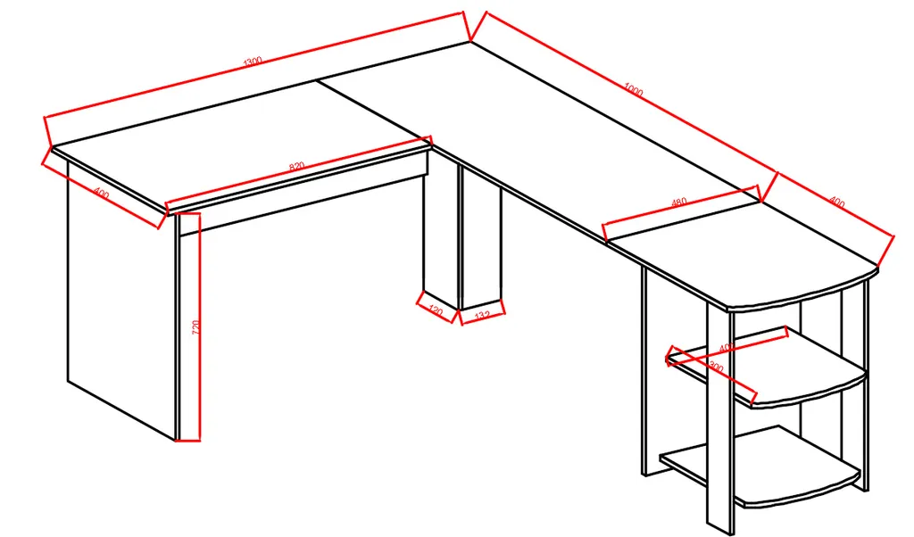 Maße der Tischplatte: 140(B)*48(T)cm (rechts), 82(B)*40(T) cm (links)