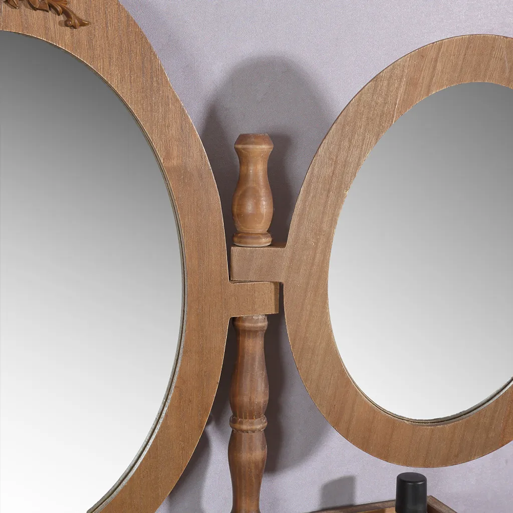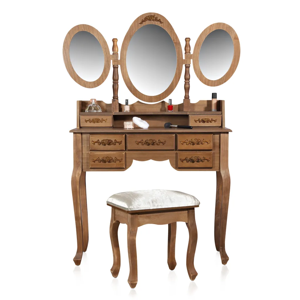 Dieser elegant-verspielte Schminktisch im Shabby Chic wird Sie begeistern. Die verschiedenen Schubladen bieten Ihnen genĂĽgend Platz fĂĽr Ihre Kosmetik- Schmuck – und Haarstyling-Utensilien. Der zierliche, shabby – braune Hocker im viktorianischem Stil vervollständigt Ihren neuen Schminkplatz. Der beiden ovalen seitlichen Spiegel sind schwenkbar und somit fĂĽr Sie nach Wunsch einzustellen.