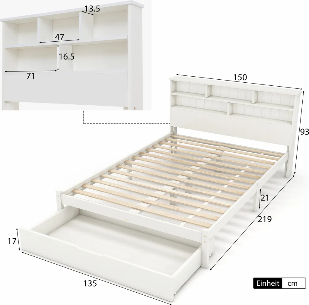- Das Bett hat die Form eines Bücherregals mit sechs Ablagefächern.Die oberen und unteren Ablagefächer sind 13,5 cm tief bzw. 16,5 cm hoch, während das obere Ablagefach 47 cm und das untere Ablagefach 71 cm breit ist. Hier können Sie Ihre Bettlektüre oder Ihre Hör-CDs aufbewahren, und die Rückwand unter dem Ablagefach ist so gestaltet, dass Sie sich beim Lesen bequem anlehnen können.