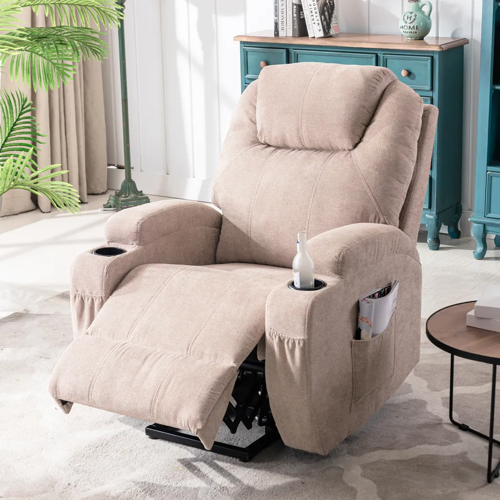 Elektrischer Hubstuhl mit eleganter Stoffoberfläche. Vier zusätzliche seitliche Aufbewahrungstaschen für Fernbedienungen, Zeitschriften usw., ideal zum Fernsehen, Lesen im Schlafzimmer, Wohnzimmer. Doppelte Getränkehalter können Getränke für ein besseres Erlebnis in der Nähe halten.