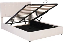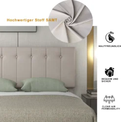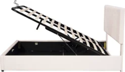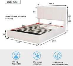 Dieses schöne gepolsterte Plattformbett verfügt über ein gepolstertes Kopfteil, das Ihrem Schlafzimmer einen modernen, schicken Look verleiht und mit dickem Schaumstoff gefüllt ist, um zusätzlichen Komfort zu bieten. Robuste Holzrahmenkonstruktion und ein Holzlattensystem für zusätzliche Stabilität und Sicherheit. Ein hydraulisches Aufbewahrungssystem unter der Matratze macht es möglich, Ihre Schlafzimmerutensilien auf kleinerem Raum zu verstauen, ohne die gewünschte Bettgröße zu beeinträchtigen. Darüber hinaus wird dieses Produkt mit einem Lamellen-Kit geliefert.