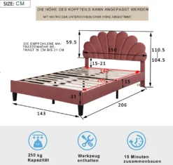 🌱【Verstärkte Lattenkonstruktion】Mit 12 verstärkten Latten wird die Matratze (nicht im Lieferumfang enthalten) gut gestützt und Ihr Körpergewicht wird für ein großartiges Schlaferlebnis gleichmäßig verteilt. Genießen Sie den Komfort und die unvergleichliche Benutzerfreundlichkeit, die das Polsterbett der Größe 140 x 200 bietet. Das Kopfteil im Blumenstil ist als bequeme Rückenlehne aus Samtstoff enthalten, die Ihnen ein gemütliches Gefühl vermittelt.