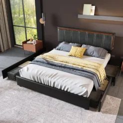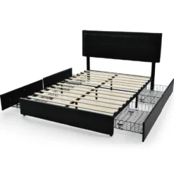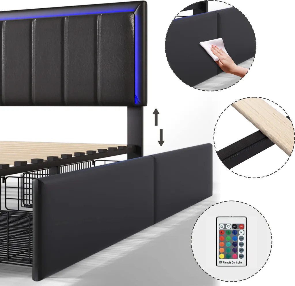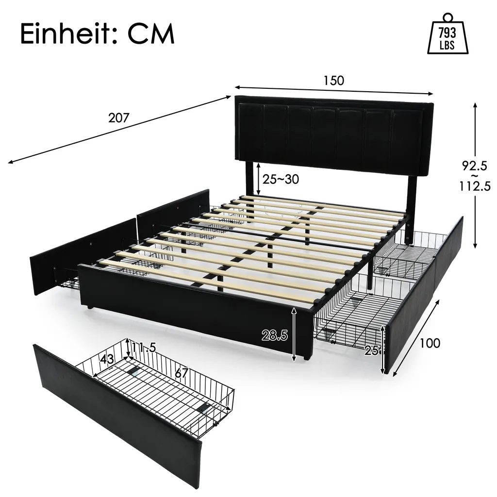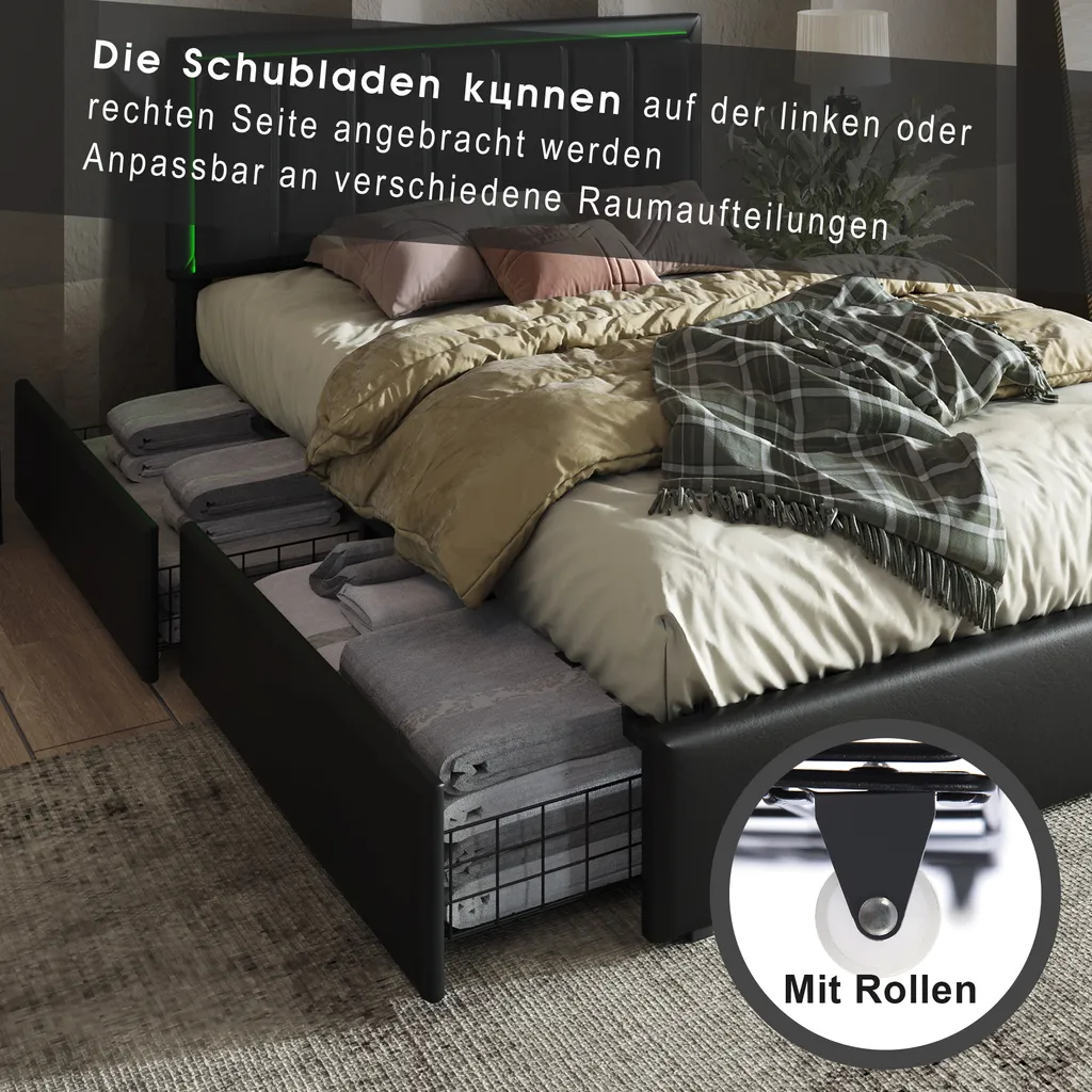 🌱【Speicherdesign】Das Bett ist mit 4 Schubladen mit großem Fassungsvermögen ausgestattet. Zwei Seiten des Bettes sind mit Schubladenschnallen ausgestattet, die es ermöglichen, die Schublade fest am Bett zu befestigen, wenn die Schublade nicht verwendet wird, damit Ihr Schlafzimmer aufgeräumt wird. Die Aufbewahrungsboxen lassen sich dank der Rollen am Boden leicht aus- und einrollen. Sie können auch die Schublade entfernen und große Gegenstände unter dem Bett aufbewahren.