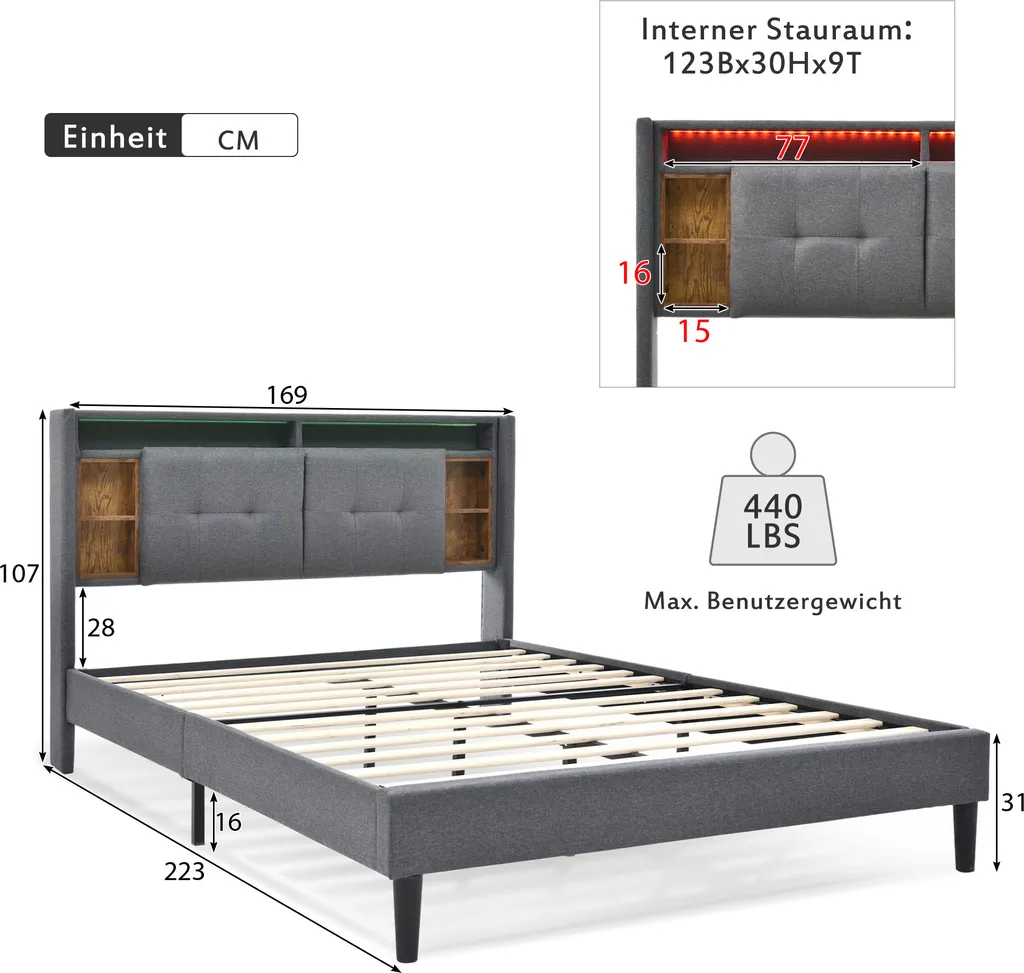 - 🌱Der Stauraum am Kopfteil ist in Innen- und Außenbereich unterteilt. Es gibt sechs Außenfächer für den täglichen Bedarf. Öffnen Sie den Bettbrettteil, um Gegenstände zu verstauen.