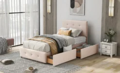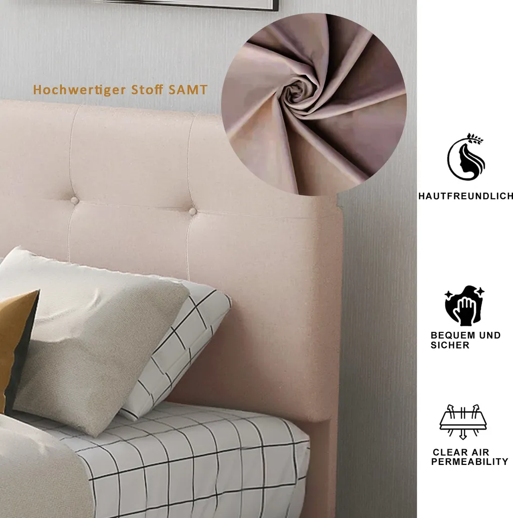 Klassische Farboptionen ergänzen jedes Möbeldekor. Es besteht aus einem Kopfteil und einer niedrigen Fußstütze, komplett mit Latten. Aufbewahrungsschubladen können verwendet werden, um Kleidung, zusätzliche Laken und mehr zu organisieren. Der hautfreundliche Flanellstoff sorgt für ein kuscheliges Kuschelgefühl und der übergroße Stauraum macht dieses gepolsterte Bettgestell zu einer tollen Wahl für alle, die ihren Platz gerne optimal nutzen