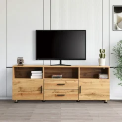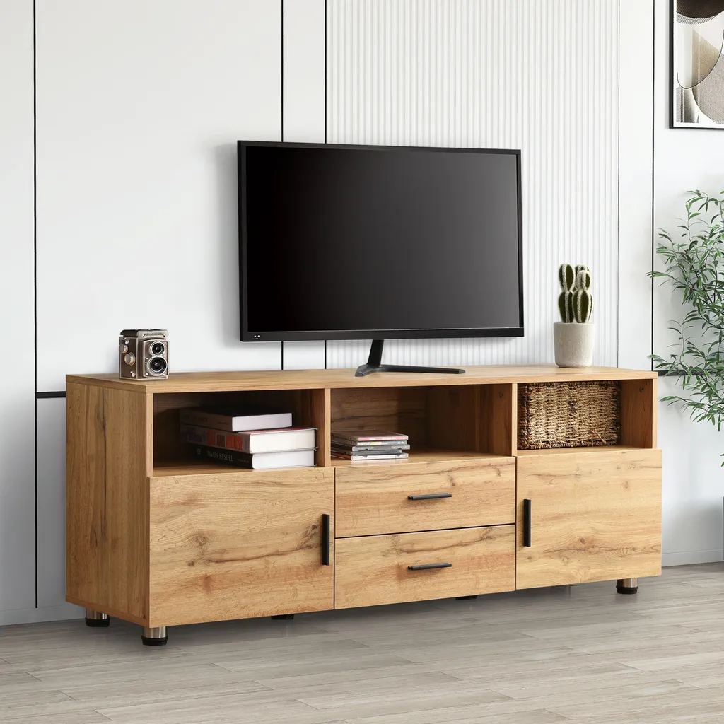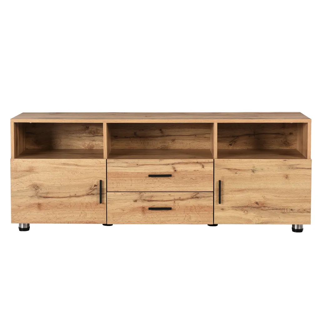 - Dieser Fernsehschrank besteht aus zwei Fächern mit Türen, zwei Schubladen und drei offenen Fächern, die viel Stauraum bieten.