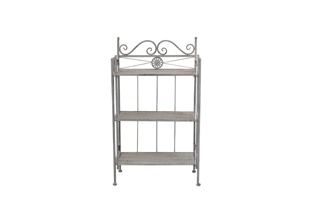 Vielseitiges Regal aus Metall, in antik-grau lackiert und gewischt. Das Regal ist aufwendig mit Verzierungen und geschwungenen Elementen verarbeitet. Ein Highlight bei dieser Regalserie, die Regale sind zusammenklappbar und können platzsparend verräumt werden. Hier bleiben Sie flexibel und gestalten Ihre Räumlichkeiten immer wieder so, wie es gerade passt.