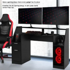 PRAKTISCH: Ein Gamingtisch mit großer Arbeitsfläche, oberer Ablage, PC-Fach rechts sowie offenen und geschlossenen Fächern und Schubladen