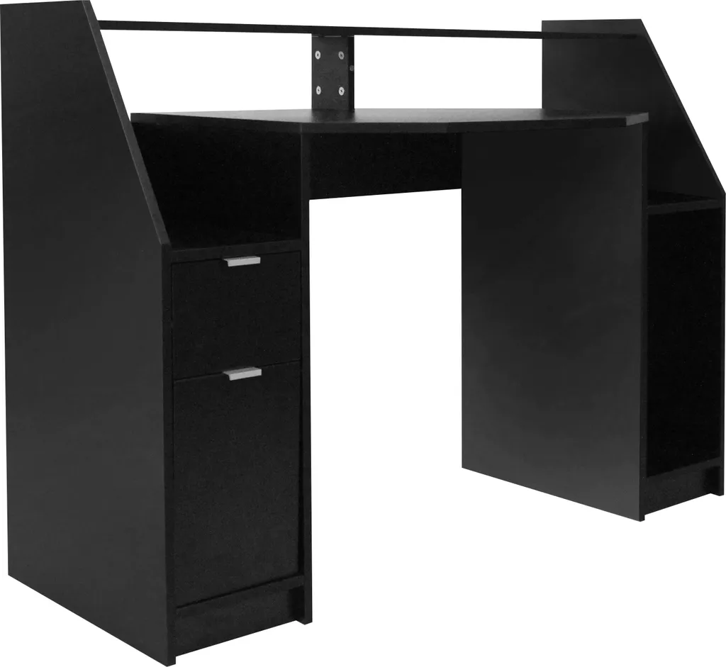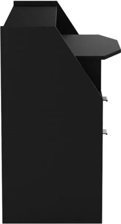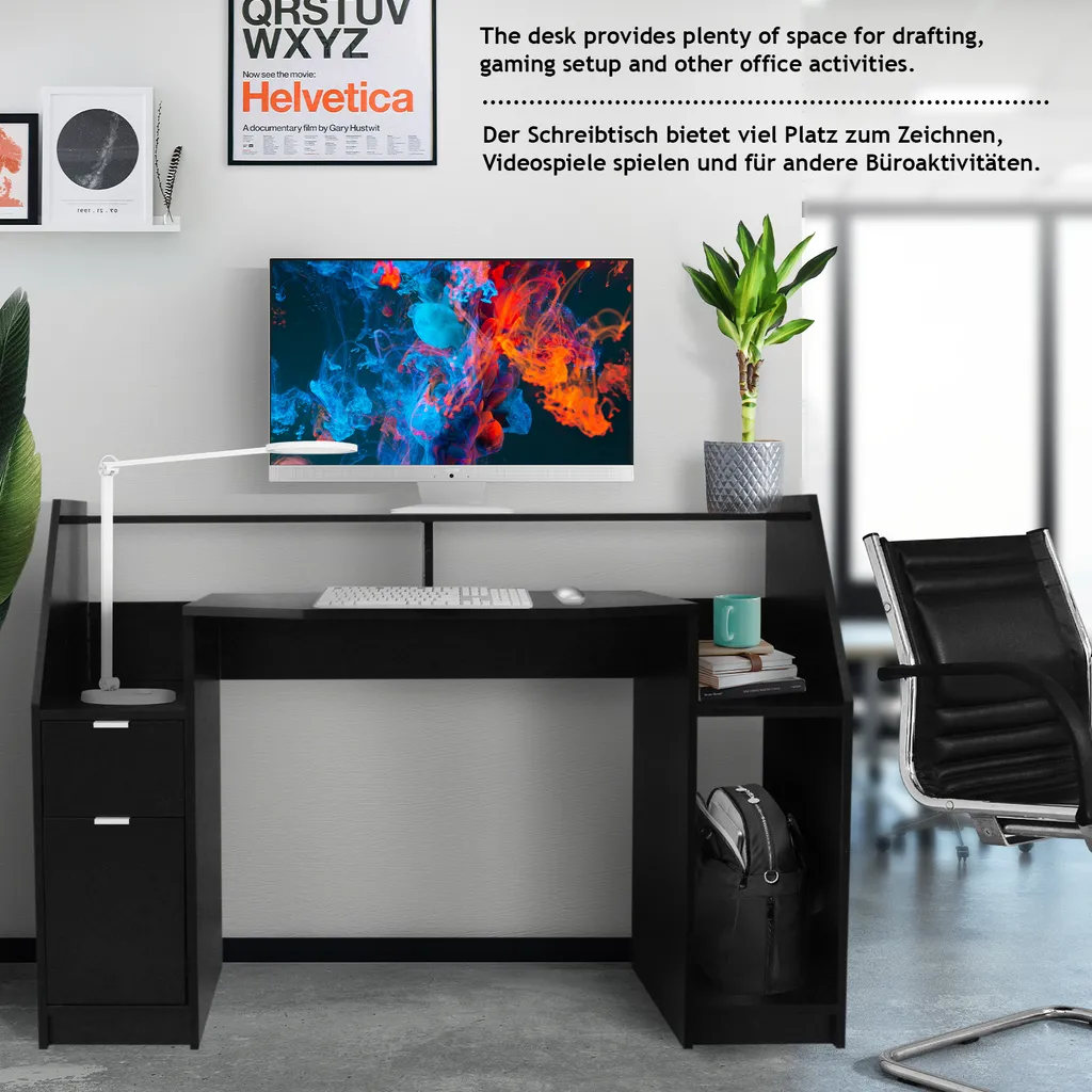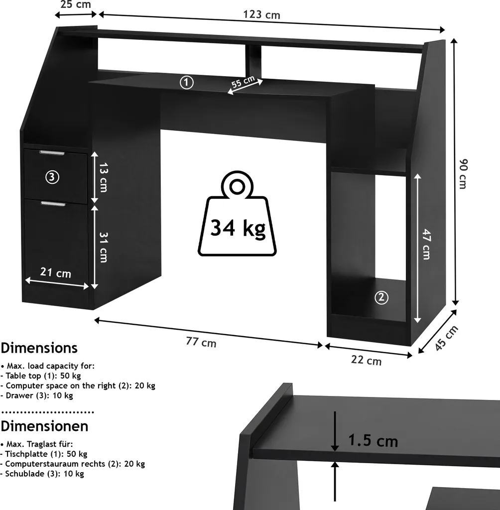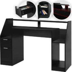 Mit einer Mischung aus klassischem Design und markanter schwarzer Eleganz ist dieser PC-Schreibtisch die perfekte Kombination aus Ästhetik und Funktionalität. Unser vielseitiger Schreibtisch verfügt über eine geräumige Arbeitsfläche, ein praktisches oberes Regal und ein großzügiges zusätzliches Staufach an der Seite, damit Sie Ihren Computer einfach positionieren und alle dazugehörigen Geräte und Zubehörteile verstauen können, um alles organisiert und ohne Unordnung zu halten.