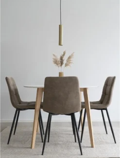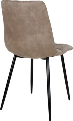 Esstischstuhl aus hellbrauner Mikrofaser. Der Stuhl ist bequem zu sitzen. Er hat eine gute Polsterung und RĂĽckenstĂĽtze. Der Esstischstuhl hat schwarze Metallbeine.