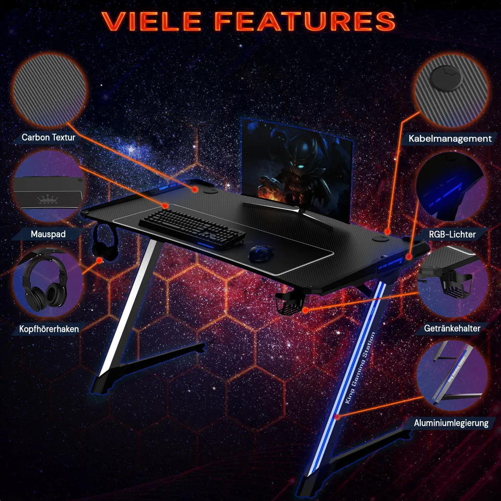 Midori® Gaming Computertisch Racing Gamer Tisch mit RGB-Beleuchtung & Carbon Optik