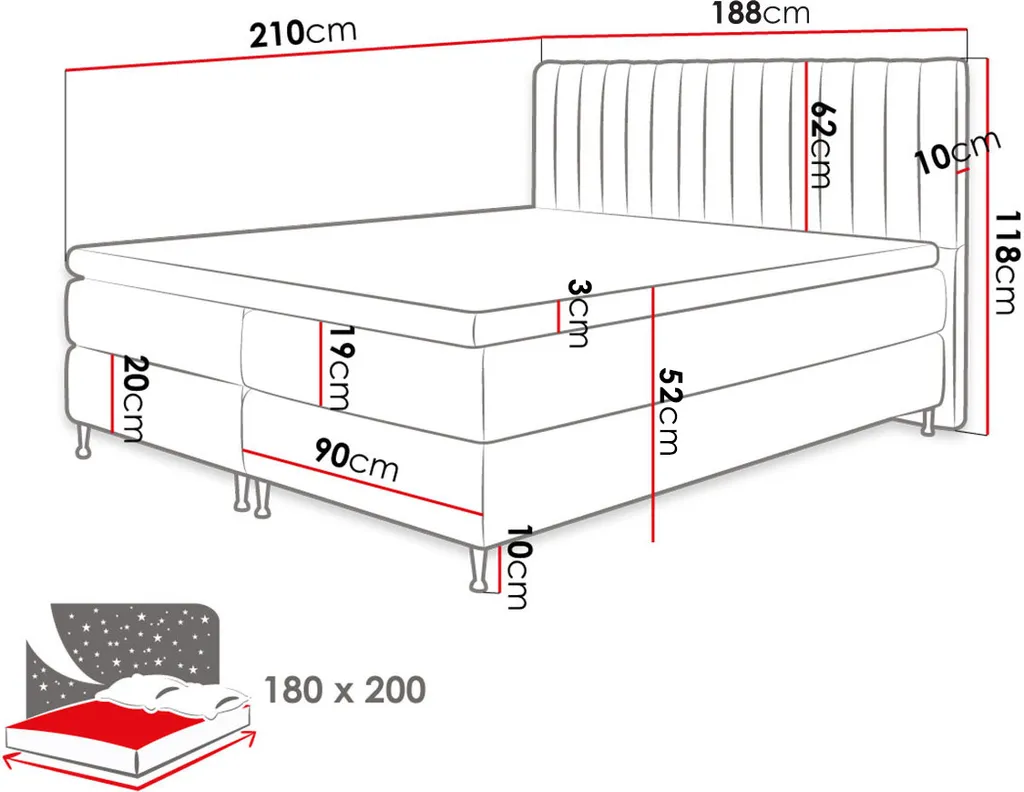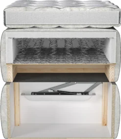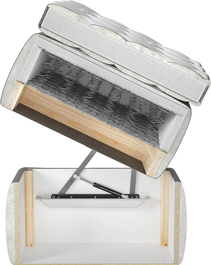 – Bettkasten aus Laminatplatte + Holz + Gasdruckfedern (erleichtert das Öffnen), - Daraufhin folgt die Hauptmatratze: