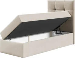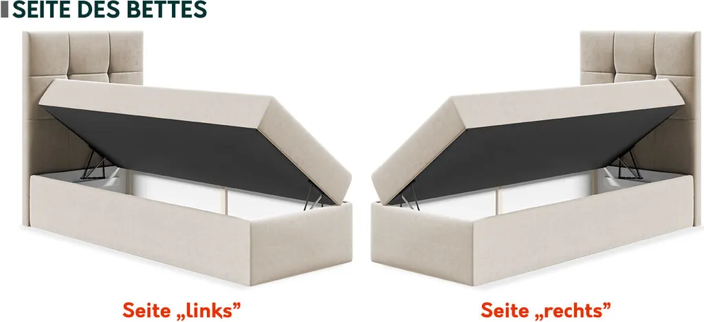 - Bett im Standard mit Bettkasten für die Bettwäsche auf beiden Seiten des Bettes. Durch Federn wird das Aufklappen erleichtert,