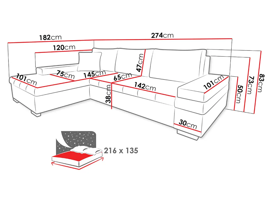 - Schlaffläche: 216×135 cm