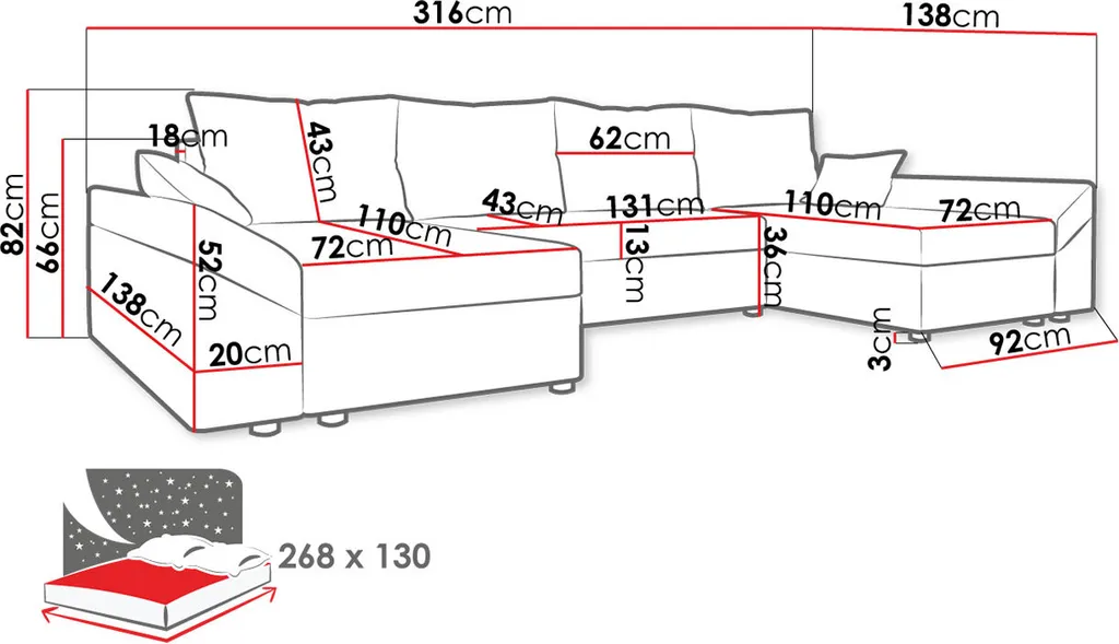 - Bettkasten: Länge: 127 cm, Breite: 52 cm, Höhe: 20 cm.