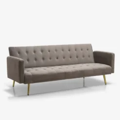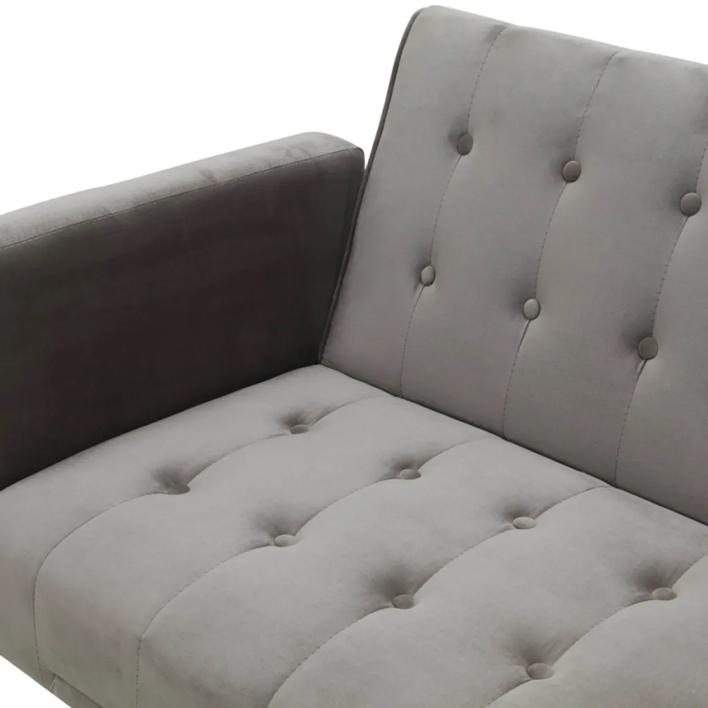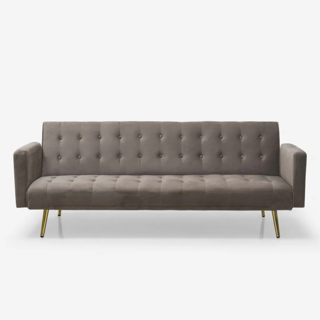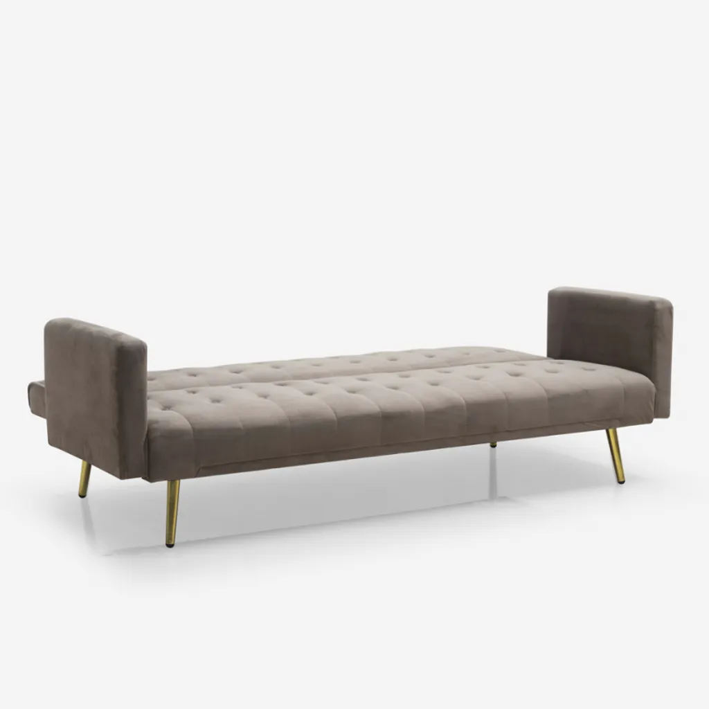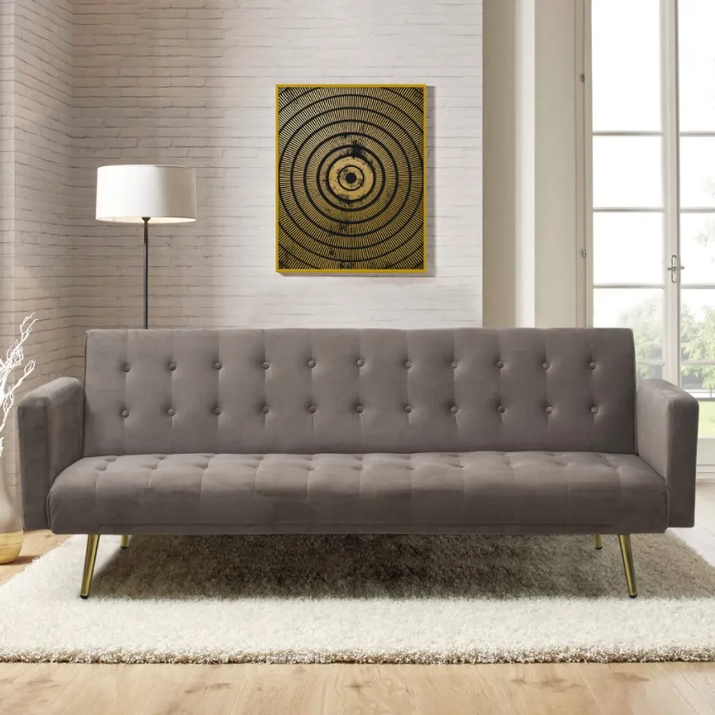 Dieses zeitlose Sofa ist dank der sorgfältigen Detaillierung ein echter Hingucker und zeichnet sich zugleich durch seine Annehmlichkeiten aus. Es eignet sich sowohl für moderne als auch klassische Einrichtungen. Es ist ein aufwendiges Modell mit 3 Sitzen aus hochwertigen Materialien: der Rahmen ist aus robustem Eukalyptusholz gefertigt und mit hochwertigem Samt bezogen, was einen schönen Kontrast zur goldenen Metallfüße ergibt. Diese verleihen dem Sofa eine gewisse Stabilität und runden das Design ab. Das weiche Material des Sitzes und des Rückens ist in einem Knopf-Stil gepolstert und mit Schaumstoff gefüllt, um Ihnen ein Maximum an Komfort zu bieten. Der verstellbare Rückenteil verwandelt das Sofa in ein komfortables Bett für Gäste oder einen kurzen Schlummer.