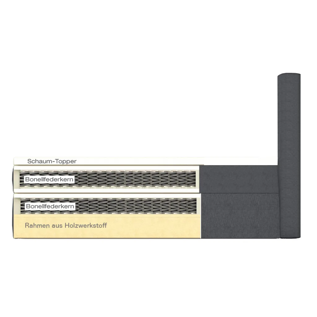 Unsere Bettbox ist mit einer Bonellfederkern-Federung ausgestattet. Die Bonellfederkern-Matratze, die unter dem Topper angeordnet ist, sorgt dafür, dass sich der Druck auf die komplette Fläche der Matratze verteilt. Daher spricht man auch von „flächenelastischen“ Matratzen. Der Topper ist eine dünne Auflage, die sich auf der Matratze befindet und somit die oberste Schicht des Boxspringbettes bildet und den Liegekomfort deutlich erhöht.