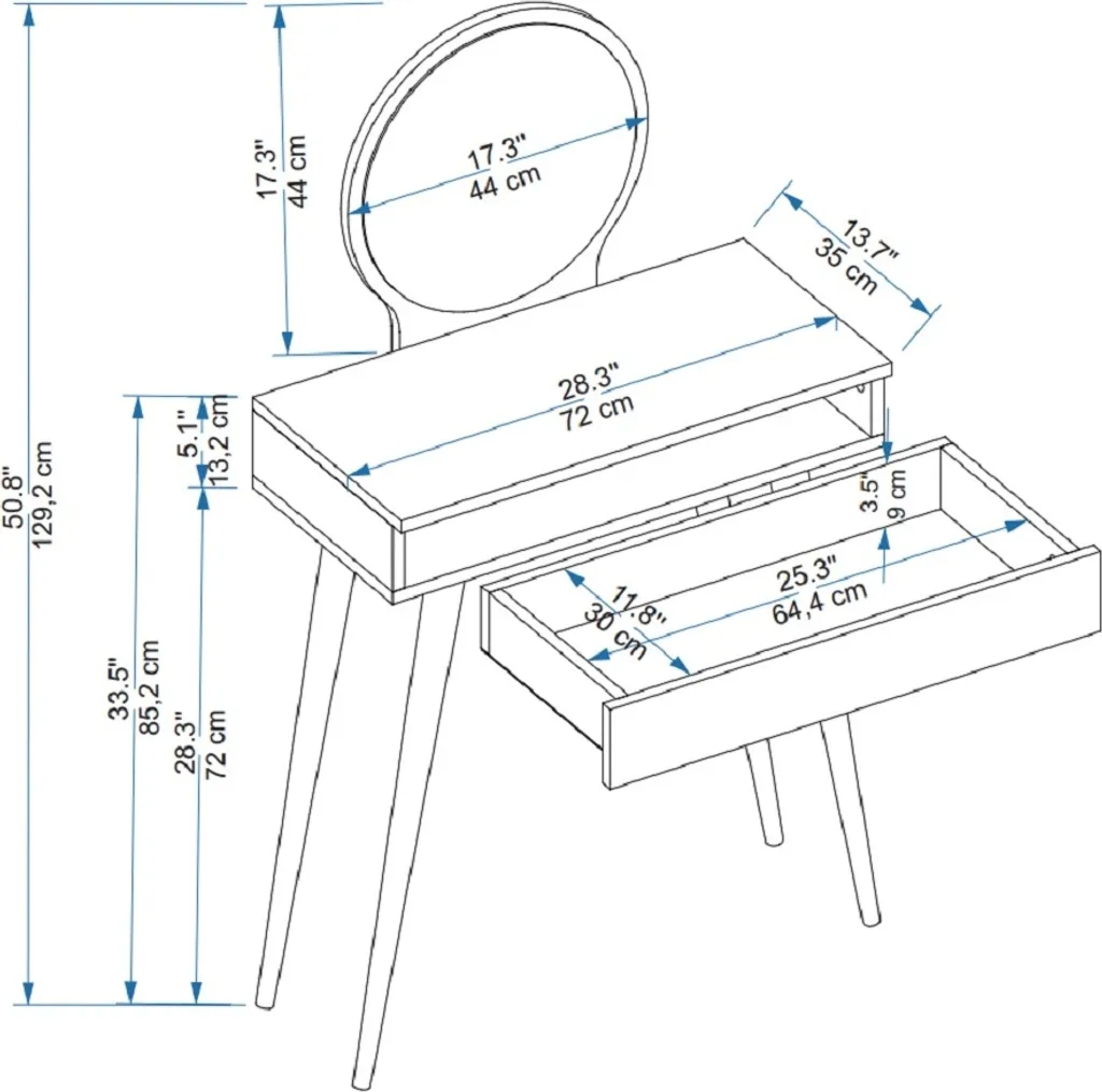 MATERIAL : Der Schminktisch besteht aus einer 18 mm dicken, hochwertigen, melaminbeschichteten Spanplatte. Die verarbeitete Holzoberfläche ist bedingt wasserfest und die Kanten sind mit PVC-Kantenband umleimt. Zum Einsatz kommt erstklassiges Montage-/Installationsmaterial und Zubehör.