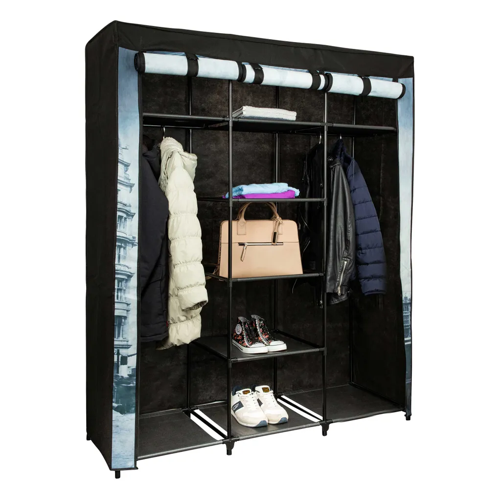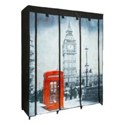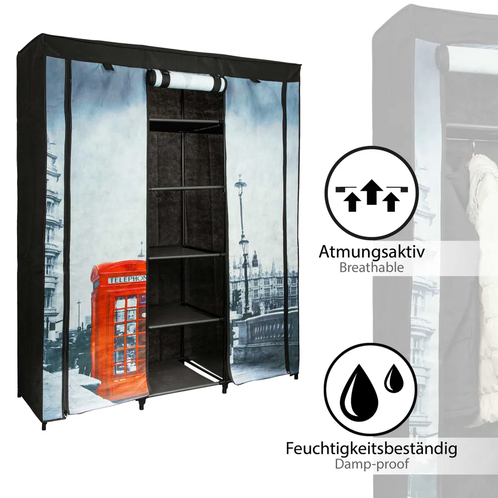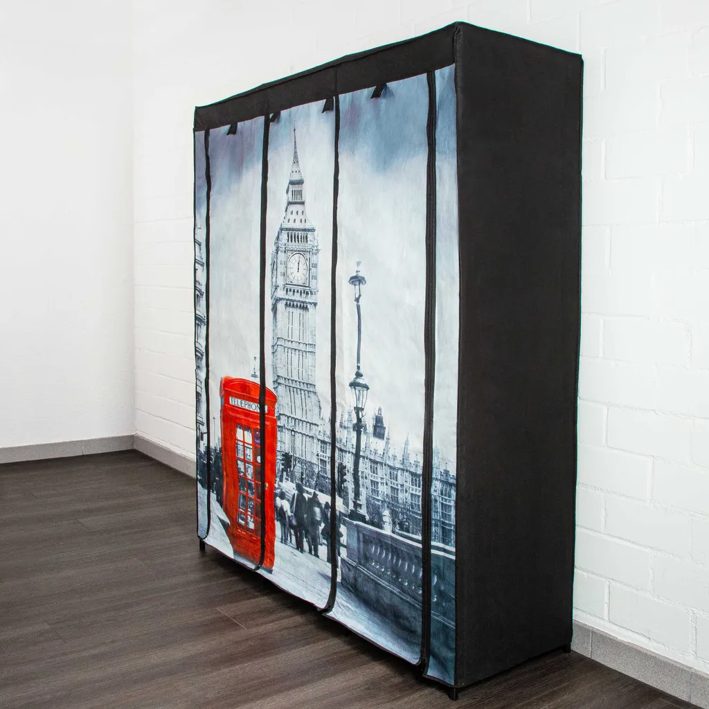 – Kleiderschrank aus schwarzem Stoff mit farbigem London-Motiv