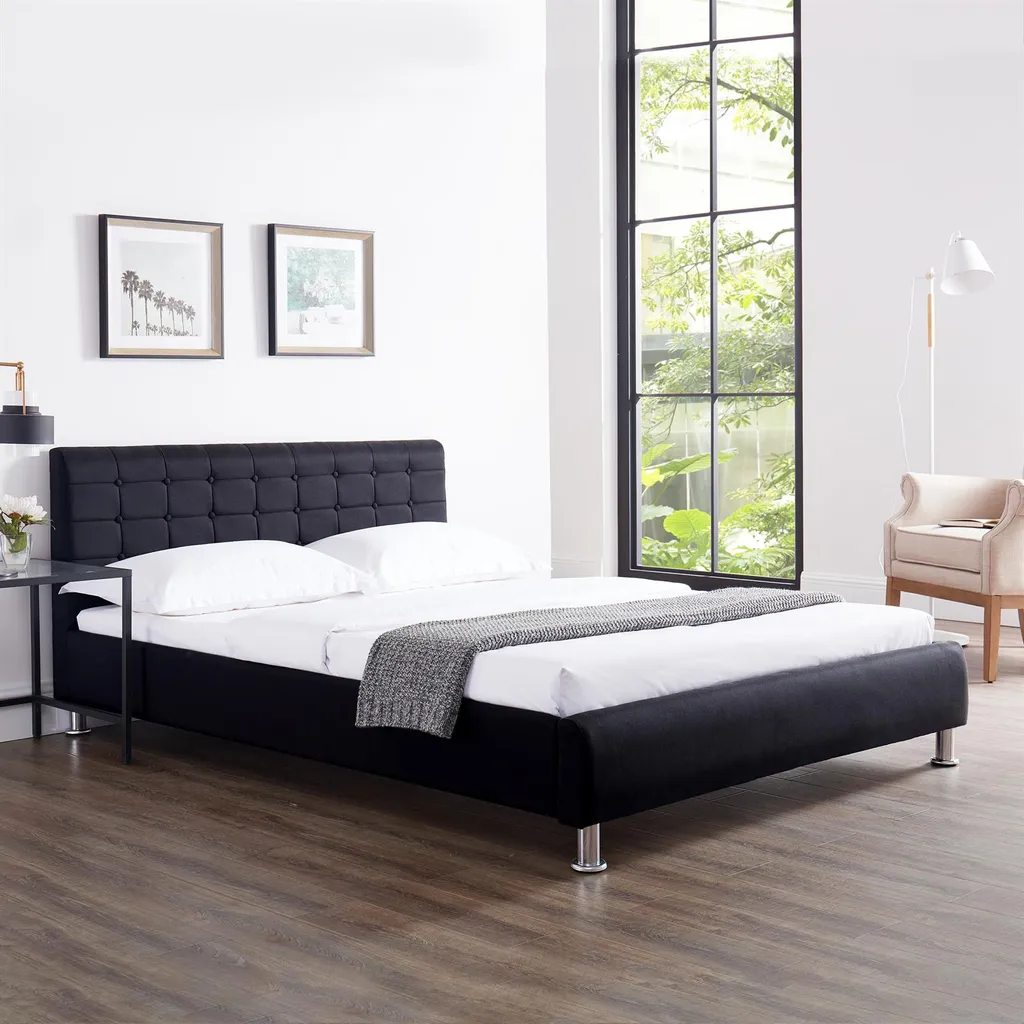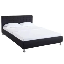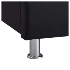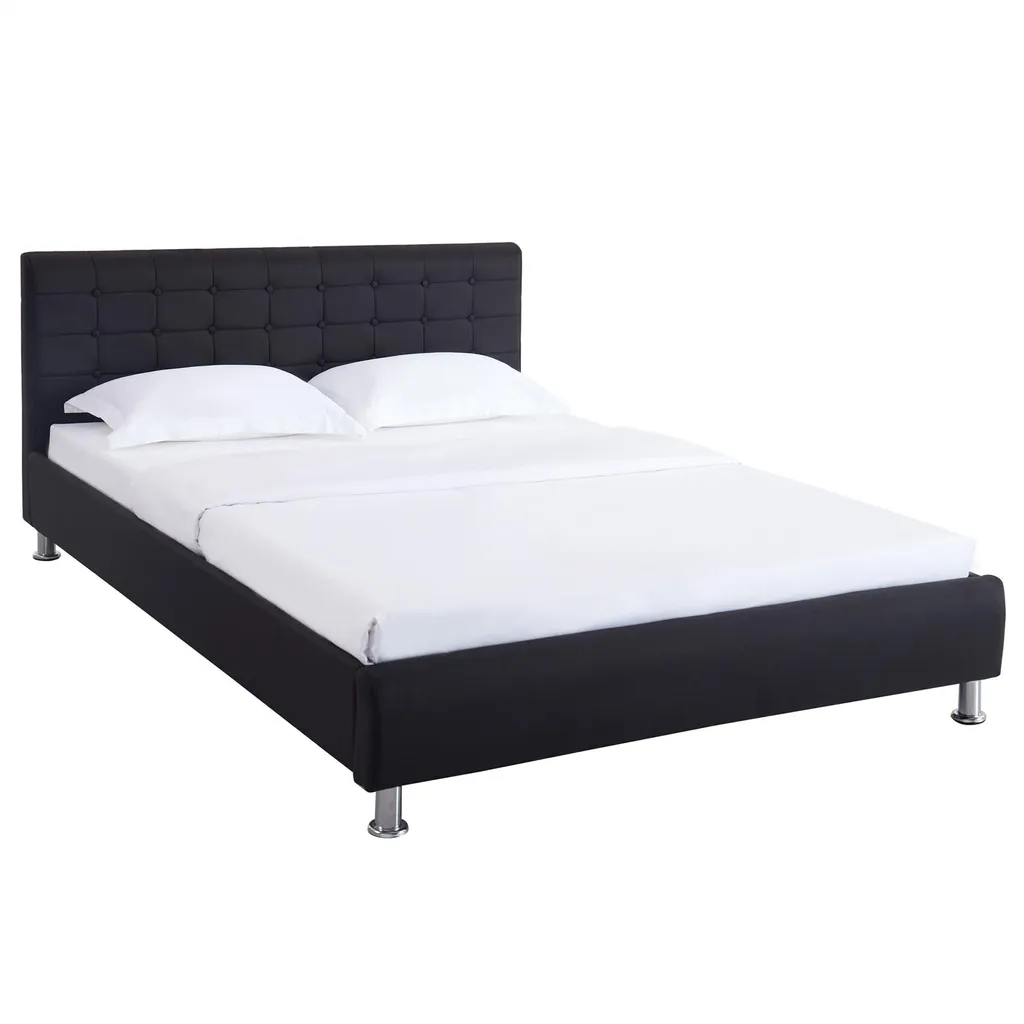 mit einer Liegefläche von 140 x 200 cm passt mit seinem eleganten und modernen Design zu vielen Einrichtungen. Das gepolsterte Kopfteil ist mit dekorativen Dekoknöpfen und Ziernähten versehen. Die Seiten und das Kopfteil sind mit Stoff in schwarz bezogen. Schauen Sie am Abend zu zweit einen spannenden Film oder genießen Sie am Sonntag zusammen das Frühstück im Bett, am Kopfteil können Sie sich bequem anlehnen. Für die nötige Stabilität sorgen die 4 verchromten Metallfüße und die Querstrebe mit den beiden Stützfüßen.