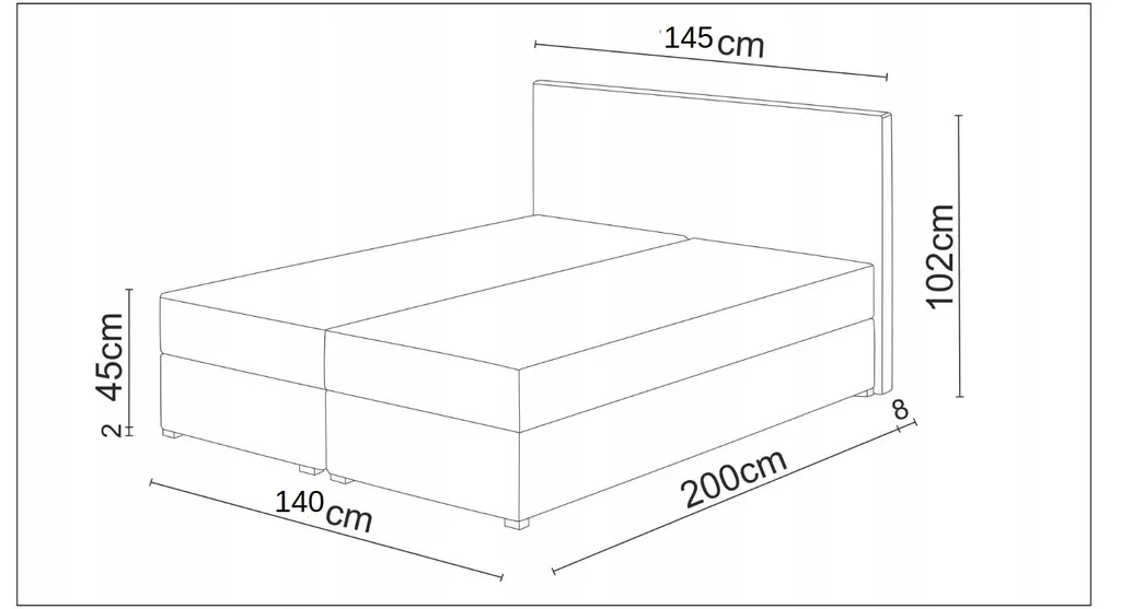 Das gepolsterte Bett ist in 4 Größen erhältlich: 140 x 200 cm, 160 x 200 cm, 180 x 200 cm und 200 x 200 cm.