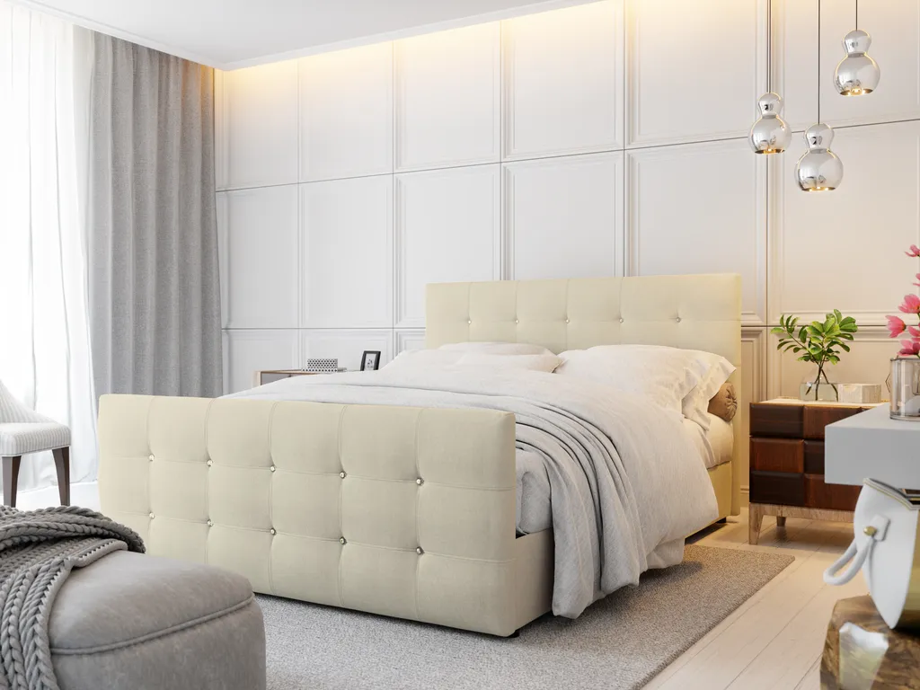 Das Boxspringbett ist ein Inbegriff der Gemütlichkeit im Schlafzimmer. Die Bettseiten, das hohe Kopf- und Fußteil sind rundum mit strapazierfähigem Polsterstoff bezogen. Das Kopf- und Fußteil sind zudem mit Knopfheftung aus Kristallen Ø 22 mm dekoriert, die dem Polsterbett eine einzigartige, Optik verleiht. Der verwendete Posterstoff weist eine hohe Verschleißfestigkeit auf, ist lichtecht, wasser- und schmutzabweisend.
