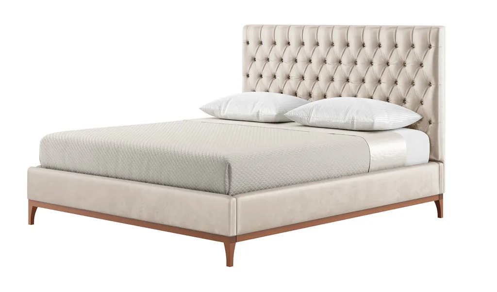 Das hohe gesteppte Kopfteil wird mit Schrauben, die im Set enthalten sind, an das Basisteil befestigt. Das Kopfteil besteht aus stabiler MDF-Platte und einer Polsterung aus hochelastischem Schaumstoff, der eine komfortable Stütze für den Rücken bietet. Das Kopfteil ist mit eigenen Beinen ausgestattet, die für zusätzliche Stabilität sorgen.