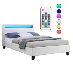 überzeugt durch sein stylisches Design. Mit seinem angenehm weichen Bezug aus Kunstleder und den schwarzen Holzfüßen, fügt es sich in jede moderne Einrichtung ein. Entspannung wird bei diesem Bett ganz groß geschrieben. Dank der integrierten LED Lichtleiste im Kopfteil und der im Lieferumfang enthaltenen Fernbedienung, können Sie zwischen den verschiedenen Lichtfarben und Leuchteffekten ganz bequem vom Bett aus wechseln.