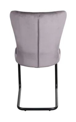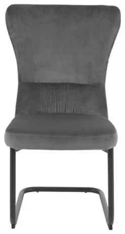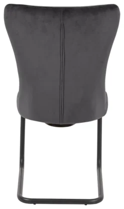 Dieser Polsterstuhl überzeugt durch sein besonders modernes Design und wird dadurch zum absoluten Hingucker in Ihrem Ess- und Wohnbereich. Die hohe Rückenlehne läd zum gemütlichen Anlehnen ein und bietet in Kombination mit dem weichen Samtbezug einen besonders angenehmen Sitzkomfort. Außerdem verleiht der Samtstoff diesem Stuhl eine entsprechend lebendige Optik, da das Stück je nach Lichteinfall seine Farbe verändert. Die abgerundeten und ausgestellten Ecken, die an die Silhoutte eines Ohrensessels erinnern, sowie die Raffung im unteren Teil der Lehne, sind kleine Details, die den eleganten Charakter des Stuhls unterstreichen. Das Untergestell aus schwarzem Metall rundet das stilvolle Design des Stuhls perfekt ab.