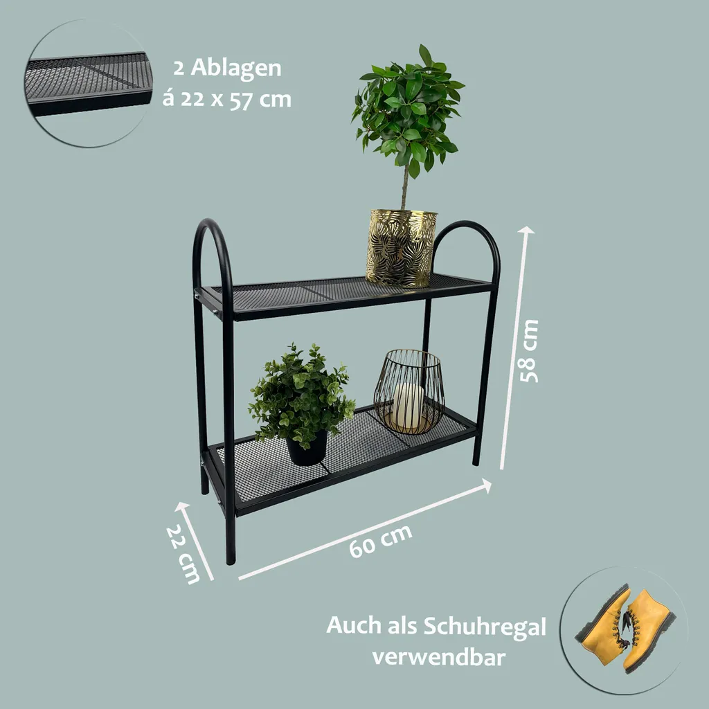 ZWEI EBENEN Der Pflanzständer erstreckt sich auf insgesamt zwei Ebenen und bietet eine solide Grundlage fĂĽr viele Pflanzen, Blumen, Deko oder auch Schuhe. Die Montage ist simpel und verlangt kein groĂźes handwerkliches Geschick.Â