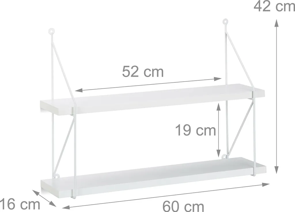 Die kleinen Hängeregale mit filigranem Seitenrahmen fügen sich dezent in Ihre Einrichtung und verschaffen Ihnen zusätzliche Ablagemöglichkeiten. Bücher, CDs oder DVDs sind auf den jeweils 2 Ebenen der Wandregale gut aufgehoben.