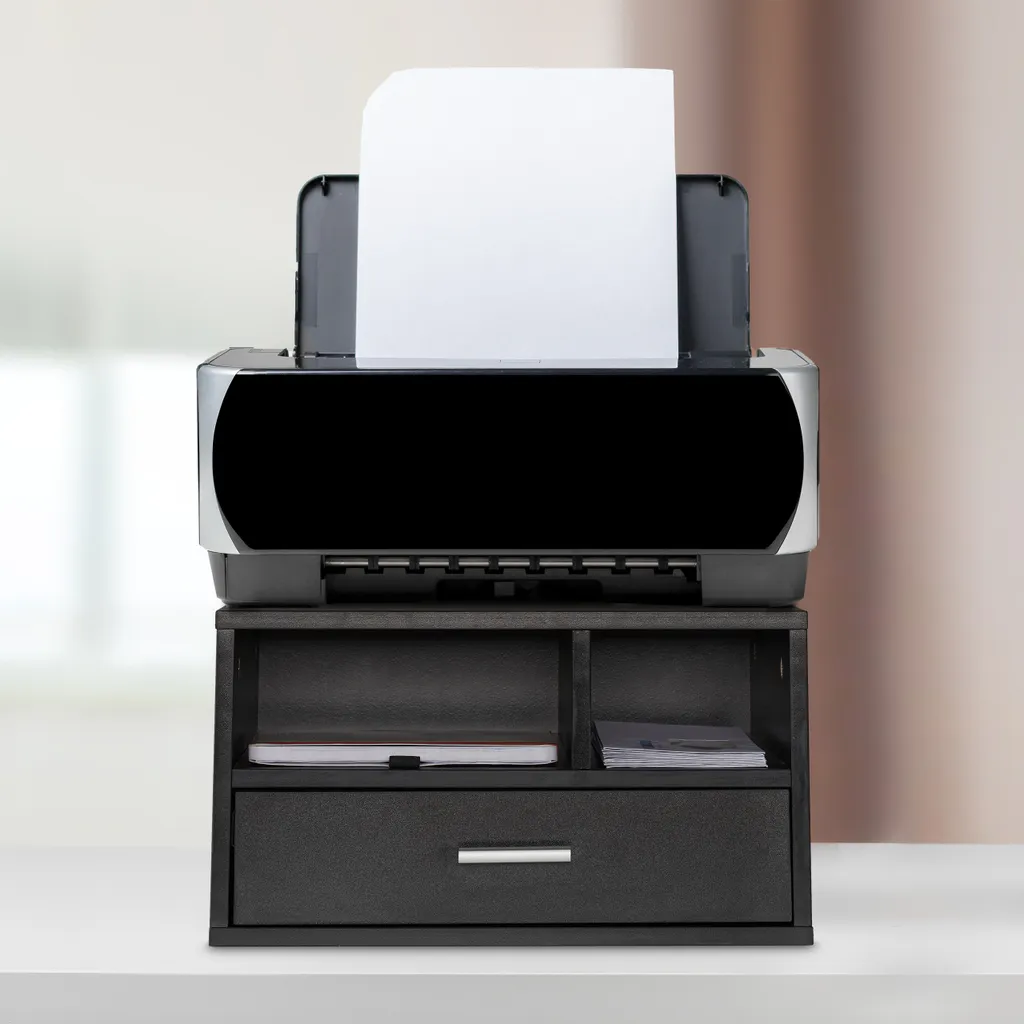Mit diesem praktischen Druckerregal geben Sie Ihrem Drucker nicht nur einen festen Platz, sondern nutzen auch den Raum darunter sinnvoll aus. In den zwei Fächern und der Schublade können Druckerpapier, Ersatzpatronen und andere Büroutensilien übersichtlich verstaut werden. Das macht das Druckertischchen zu einem cleveren Accessoire für jedes Büro. Das schlichte und moderne Design fügt sich gut auf dem Schreibtisch ein.