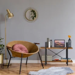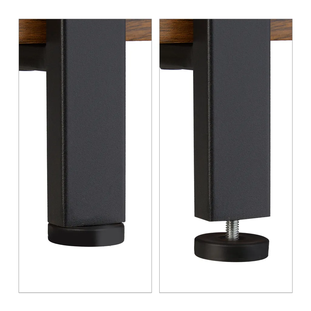 Dieses Wohnzimmerregal bietet viel Stauraum für Bücher, Ordner, Bilder, Deko oder auch Pflanzen. Dabei wurden die 2 Ebenen in dunkelbrauner Holzoptik mit einem schwarzen Metallrahmen kombiniert. Mit diesem angesagten Industrie Look kann das Standregal im Wohnbereich, Schlaf- oder Arbeitszimmer sowie in Küche oder Flur überzeugen. Für optimale Stabilität sorgen die verstellbaren Bodenschoner, mit denen der Boden vor Kratzern geschützt und das Regal vorm Kippeln bewahrt wird.