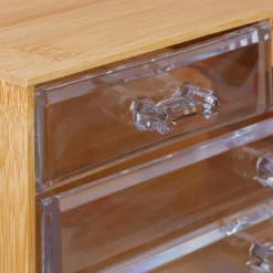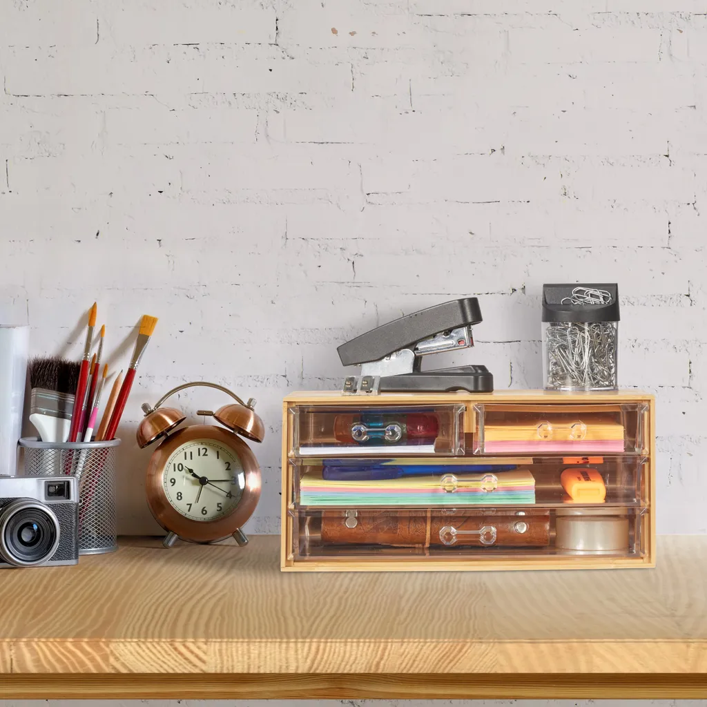 Diese praktische Schminkablage schafft Ordnung auf Deinem Schminktisch und erspart Dir das Suchen in der Kosmetiktasche. Mit insgesamt 4 entnehmbaren Schubladen bietet die kompakte Kosmetikaufbewahrung viel Stauraum fĂĽr Make Up aller Art. Du kannst aber auch Deinen Schmuck, Deine Schreibutensilien und vieles mehr ĂĽbersichtlich in die Aufbewahrungsbox einsortieren. Die Schminkablage aus robusten Bambus ĂĽberzeugt mit ihrem modernen und zugleich harmonischen Design.