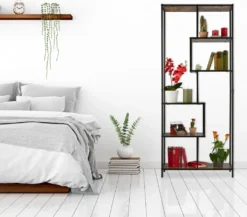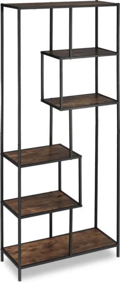 Das Vintage Regal ist der ideale Blickfang für jedes Wohn-, Schlaf- oder Arbeitszimmer. Das moderne Industrial Design aus schwarzem Metall und dunkelbrauner Holzoptik gibt dem Bücherregal eine elegante Note. Die kleineren Ebenen des Standregals eignen sich perfekt für Bücher oder Zeitschriften und in den größeren Fächern und auf der Oberseite finden Pflanzen, Deko und Lampen einen schönen Ort. Zudem kann das Hochregal auch ideal als Raumteiler eingesetzt werden.