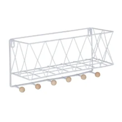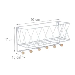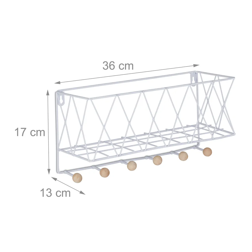 Das stylische Wandregal mit 6 Garderobenhaken ist ideal zum Aufhängen von Mänteln, Jacken, Hüten oder Schlüsseln. In dem oberen Gitterkorb können Accessoires wie Tasche, Schal oder Mütze verstaut werden. Die Haken aus hellem Holz bilden einen schönen Kontrast zum restlichen Regal aus pulverbeschichtetem Metall. Auch im Badezimmer zum Aufhängen von Handtüchern und Bademänteln und Verstauen von Badaccessoires macht das Metall Wandregal eine gute Figur.