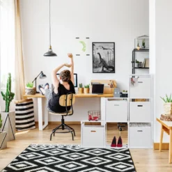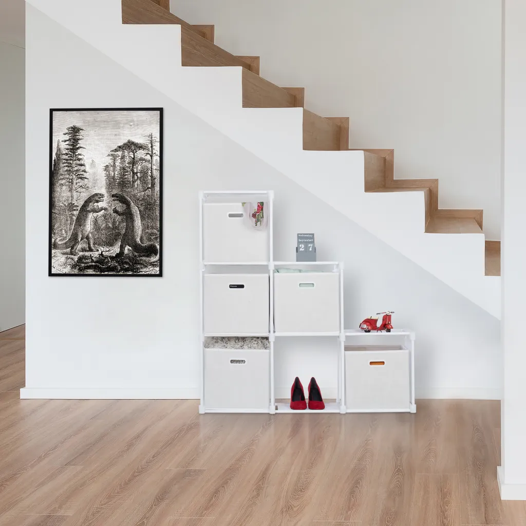 Nutze den Platz unter Deiner Treppe oder Dachschräge mit dem modularen Stufenregal. Du kannst die offenen Flächen als Ablagen nutzen oder Deine Sachen in den praktischen Stoffkörben verstauen. Zum Entnehmen kannst Du die Kisten an den Griffmulden herausziehen. Verwende das Regal als Raumteiler im Wohnzimmer oder zur Aufbewahrung von Schals im Flur. Auch für das Jugendzimmer eignet sich das Treppenregal hervorragend. Passe Dein Würfelregal dank des einfachen Stecksystems an Deine Bedürfnisse an.
