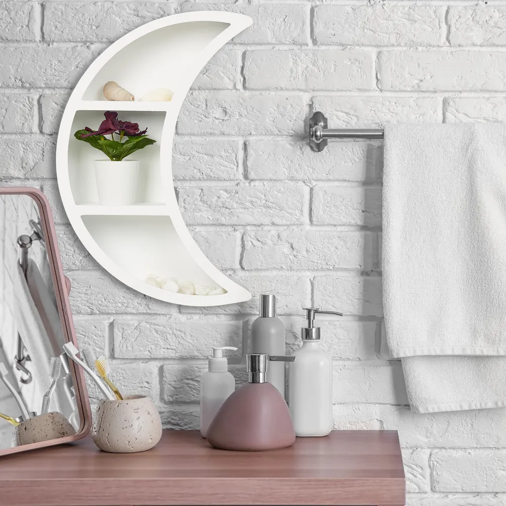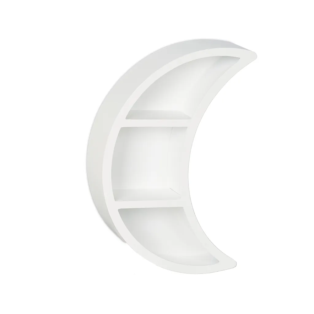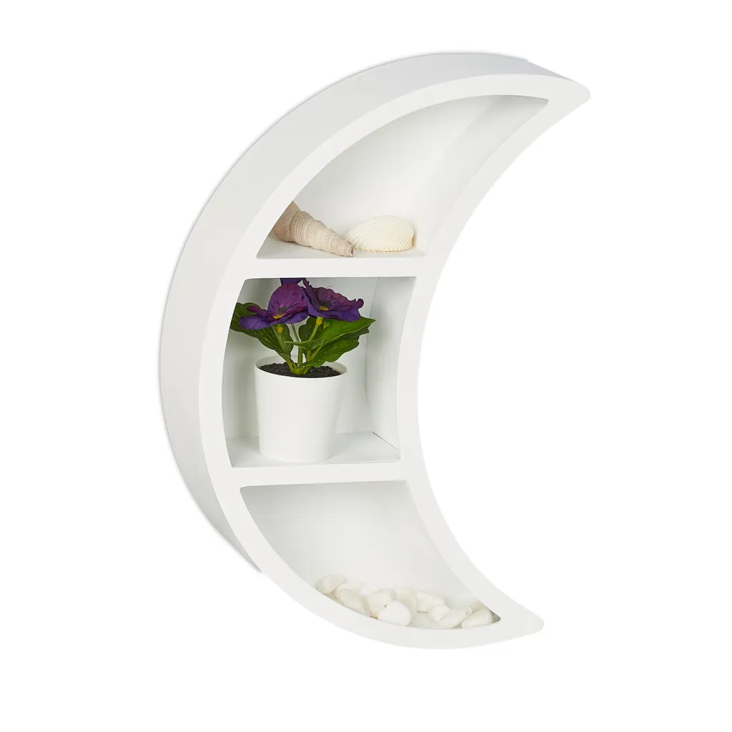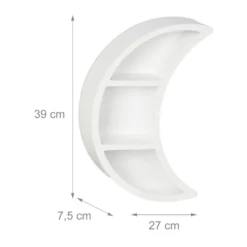 Mit dem weißen Mondregal hauchst Du leeren Wänden neues Leben ein. Im Wohnzimmer setzt das Schweberegal mit 3 Fächern Dekoartikel und Souvenirs in Szene, im Kinderzimmer eignet es sich zur Präsentation von Spielfiguren. Dank der dekorativen Halbmondform ist das Hängeregal auch selbst ein absoluter Hingucker und verleiht Deinem Wohnbereich ein träumerisches Flair. Mit dem beiliegendem Montagematerial ist das Regal im Nu an der Wand befestigt.