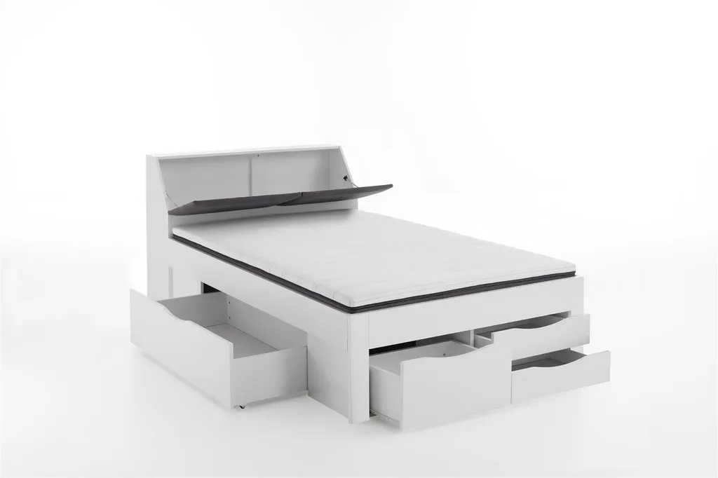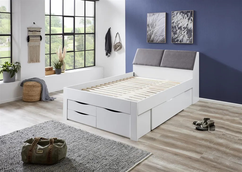 Funktionsbett Maxi mit Liegefläche 140 x 200 cm, mit 4 Bettschubladen und Stauraum-Polster-Kopfteil. Das Trägermaterial ist 18 mm Spanplatte und hat eine pflegeleichte Oberfläche inNachbildung Weiß. Dieses Bett verbindet Komfort und Stauraum miteinander. Die Blenden der Posterkopfteile (ca. 40 cm hoch) sind zum klappen, wodurch der Zugang zum Stauraum im Kopfteil ermöglicht wird. Hier kann man Bettwäsche oder andere Dinge gut unterbringen. Die Polsterung der Kopfteilblenden ist aus 100% Polyester, nicht abnehmbar, nicht waschbar. Sie bieten optisch einen guten Absatz zum weißenNachbildung. Das Bett hat eine Seitenhöhe, vom Boden bis Oberkante der Bettseite von ca. 55,8 cm. Bei dieser Komfort-Liegehöhe fällt der Einstieg ins Bett leicht. Die Einlegetiefe für die Matratze und das Lattenrost beträgt ca. 9 cm. Da diese nicht zum Lieferumfang gehören, können Sie frei entscheiden welche Rahmen/Matratzenkombination Sie wählen. Generell ist der Mittelsteg im Lieferumfang enthalten. Unter dem Bett befinden sich 5 Schubladen, die Ihnen viel Stauraum bieten. Am Fußende sind zwei kleine Schubladen übereinander (Innenmaß ca.: B: 50 x H: 9 x T: 30 cm), rechts daneben eine große Schublade (Innenmaß ca.: B: 50 x H: 19 x T: 30 cm). Die große Schublade seitlich rechts und links am Bett, hat ein Innenmaß ca.: B: 115 x H: 19 x T: 58 cm. Die Dekoration, Lattenrost und die Matratze gehören nicht zum Lieferumfang. Stellfläche Bett ca.: B: 145 x H: 103,8 x T: 237,5 cm. Der Artikel ist zerlegt zur einfachen Selbstmontage.