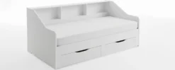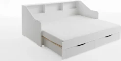 Das Funktionsbett Rene ist ein ideales Bett für das Kinder- oder Gästezimmer. Die normale Liegefläche ist im Maß 90 x 200 cm. Durch ausziehen des Unterbaus erweitert sich diese auf 180 x 200 cm und kann als Doppelbett, mit einer durchgehenden Liegefläche, genutzt werden. Zudem hat das Bett zwei geräumige Schubladen unter der Liegefläche, die zusätzlich Stauraum bieten. Das Schubladen Innenmaß ist ca.: B: 81,2 x H: 12,7 x T: 48,4 cm. Rückseitig gibt es noch ein praktisches Regal, das als Ablage für Bücher, Mediengeräte oder das dekorativ gestaltet werden kann. Das Innenmaß der Regalfächer ist ca.: B: 65,8 x H: 26,4 x T: 14,6 cm. Die Seitenteile sind hinten 88,9 cm hoch und vorne ca. 65 cm. Die Einstiegshöhe ist ca. 30 cm. Der Korpus und die Fronten bestehen aus hochwertigem Holzwerkstoff MDF Weiß lackiert. Die Schubladen haben eine praktische Griffaussparung, wodurch sie sich leicht öffnen und schließen lassen. Die Lattenroste sind bereits im Lieferumfang enthalten. Die Einlegetiefe der Matratze beträgt ca. 5 cm. Wenn Sie zwei Matratzen 90 x 200 cm nebeneinander legen, decken Sie die Liegefläche von 180 x 200 cm ab. Die Matratzen und die Deko gehören nicht zum Lieferumfang. Die Beschläge sind aus Metall. Belastbarkeit pro Liegefläche ca. 80 kg. Die Ware ist zerlegt, mit Montageanleitung zur einfachen Selbstmontage. Stellfläche ca. : B: 205,6 x H: 88,9 x T: 112,9/205/247,5 cm (Bett, 2. Liegefläche, Schubladen).