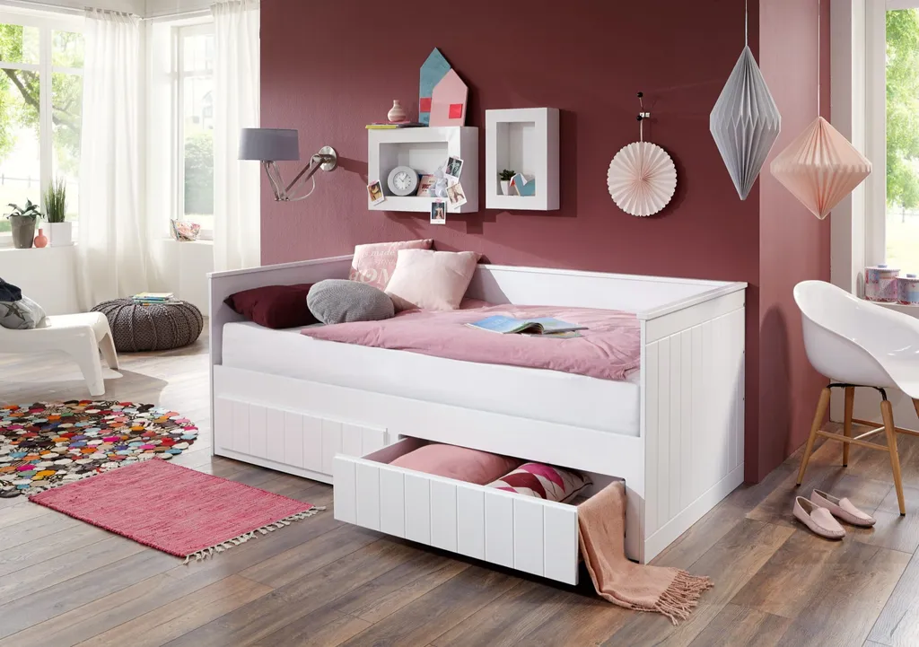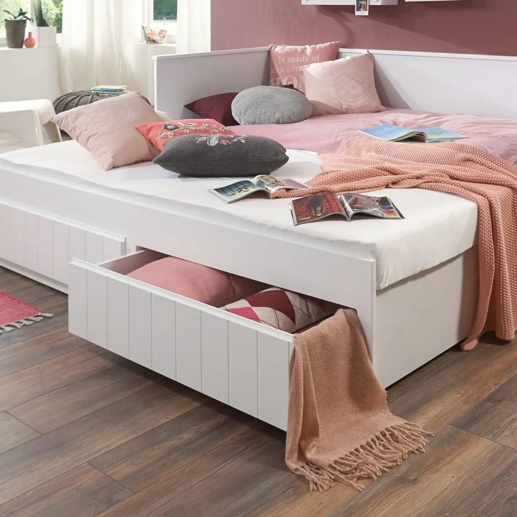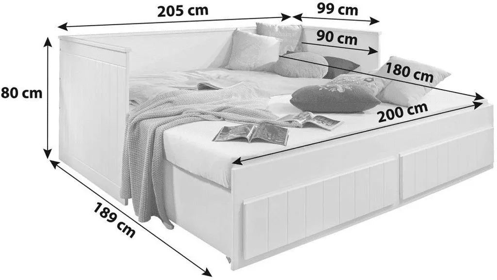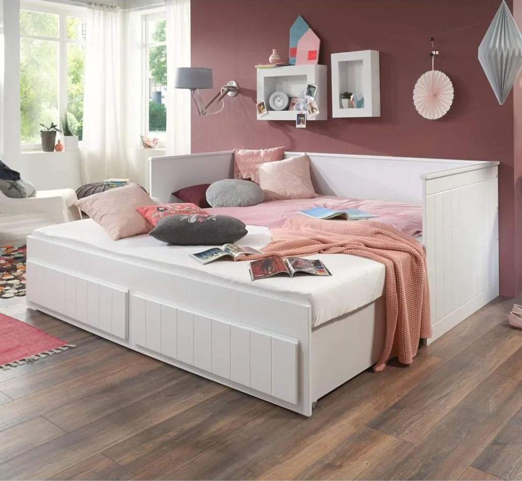 Das praktische Funktionsbett Timmi hat die Einzelbett und Doppelbett-Funktion in einem. Die normale Liegefläche ist im Maß 90×200 cm. Durch ausziehen des Unterbaus erweitert sich diese auf 180 x 200 cm und kann als Doppelbett genutzt werden. Zudem hat das Bett zwei geräumige Schubladen, die zusätzlich Stauraum bieten. Das Schubladen Innenmaß ist ca. B: 78 H: 10 T: 45 cm. Der Korpus und die Fronten bestehen aus hochwertigem MDF in weiß lackiert. Das Kopf- und Fußteil sowie die Schubladenfronten haben außen ein Rillenprofil. Das Bett ist komplett ausgestattet da die Lattenroste bereits im Lieferumfang inbegriffen sind. Die Einlegetiefe der Matratze beträgt ca. 12 cm. Sie können auch zwei Matratzen übereinander legen, da die Seiten und das Rückenteil so hoch ist, das man noch bequem sitzen kann. Sie brauchen dann die zweite Matratzen nur nach vorne zu klappen und das Bett mit 180x 200 cm Liegefläche ich fertig. Die Matratzen und die Deko gehören nicht zum Lieferumfang. Die Beschläge sind aus Metall. Die Ware ist zerlegt, mit Montageanleitung zur einfachen Selbstmontage. Stellfläche: B: 205 x H: 90 x T: 95/180/220 cm (Bett, 2. Liegefläche, Schubladen).