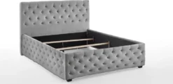Das Polsterbett Chester zeichnet sich durch ein klassisches Chesterfield Design aus. Mit einer Liegefläche von 140 x 200 cm bietet es Ihnen viel Platz und Schlafkomfort. Besonders ist sind die höhenverstellbaren Rahmenauflagen. Diese sind 4-fach verstellbar, was den Komfort der Liegehöhe noch unterstreicht. Das Bett ist nur für feste Lattenroste geeignet, nicht für Rolllattenroste oder Motorrahmen. Das stabile und gepolsterte Bettgestell aus hochwertigem Holzwerkstoff, sowie das aufwendig gearbeitete Kopfteil, Fußteil und die Seiten haben die Chesterfield Optik. Dies ist kennzeichnend für das Bett. Das volumig aufgepolsterte und elegante Kopfteil (ca. 11 cm tief), ist wie der Bettrahmen, mit einem Polsterstoff aus 100% Polyester bezogen. Die Höhe des Kopfteils mit 120 cm, gibt dem Bett eine ausgewogene Optik. Die Höhe von Boden bis zur Oberkante der Bettseite sind ca. 45 cm. Das Bett hat eine Bodenfreiheit von ca. 5 cm, was der Luftzirkulation förderlich ist. Da das Bett ohne Lattenrost geliefert wird, können Sie die Ausstattung Ihres Bettes, mit Rahmen und Matratze selbst bestimmen. Als Einlegetiefe für Lattenrost und Matratze stehen ca. 10-15 cm zu Verfügung. Die verstellbaren, quer verlaufenden Rahmenauflagen mit verstellbarem Fuß gehören zum Lieferumfang. Die Dekoration, Lattenrost und die Matratze gehören nicht zum Lieferumfang. Max. Belastung ca. 130 kg. Stellfläche Bett ca.: B: 156 x H: 120 x T: 212 cm. Der Artikel ist zerlegt zur einfachen Selbstmontage.