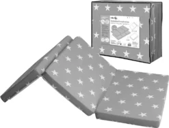 Die roba Reisebettmatratze ‚Little Stars‘ passt mit einem Matratzen-Maß von 60 x 120 cm in alle gängigen Reise- & Babybetten. Die Kindermatratze ist vielseitig einsetzbar und findet unterwegs als komfortable Babybett-Ausstattung im Reisebett oder im Kinderzimmer als Sitzhocker und Spielmatratze lange Verwendung. Ebenso eignet sich die Matratze für einen Besuch kleiner Übernachtungsgäste. Auf Reisen oder unterwegs lässt sich die Matratze 2-fach auf 40 x 60 cm falten und in der praktischen, staubsicheren Transporttasche platzsparend verstauen. So bleibt sie hygienisch sauber und lässt sich einfach tragen. Der weiche und atmungsaktive Bezug aus strapazierfähiger Baumwolle in grau mit weißen Sternen ist durch einen Reißverschluss leicht abnehmbar und bei 30° waschbar. Die 2-fach faltbare roba Reisebettmatratze ‚Little Stars‘ mit Baumwoll-Bezug hat aufgeklappt die Maße 120 x 60 x 5,5 cm, geschlossen ist sie 40 x 60 cm groß.