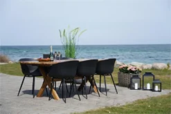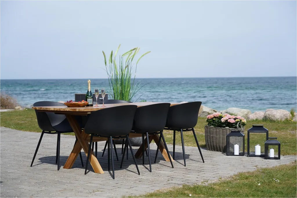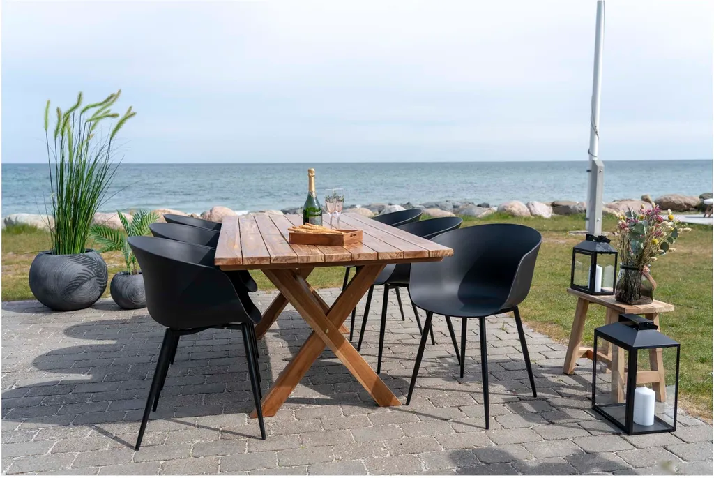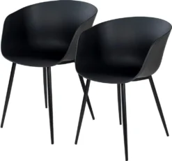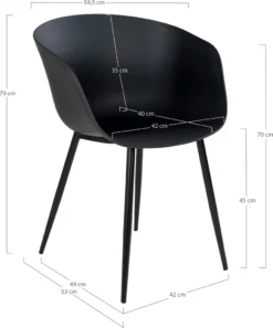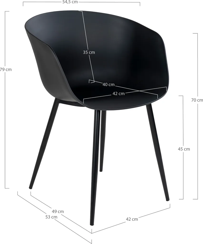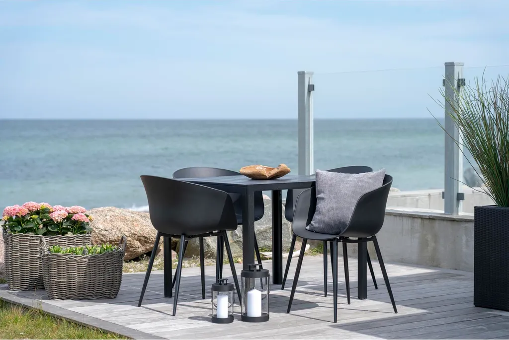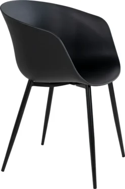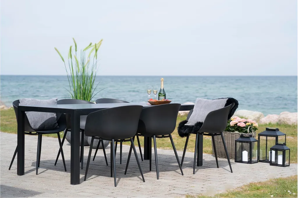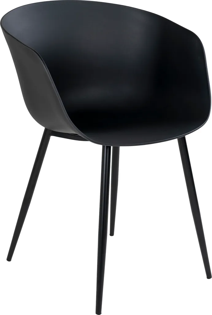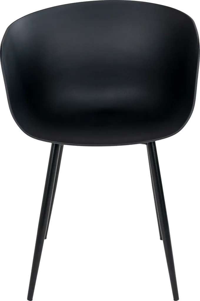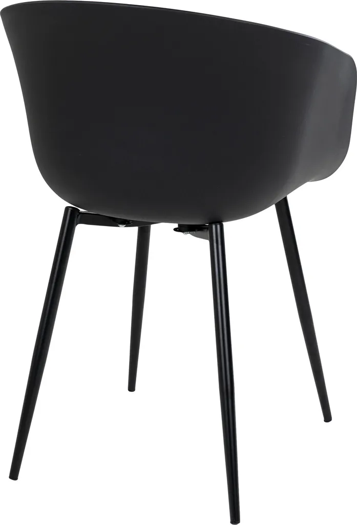 Ein schöner schwarzer Roda Esstischstuhl, der sowohl drinnen als auch draußen verwendet werden kann. Der Stuhl hat einen einfachen und feinen Ausdruck. Der Stuhl hat schwarze feine Beine und passt perfekt in ein minimalistisches Zuhause.