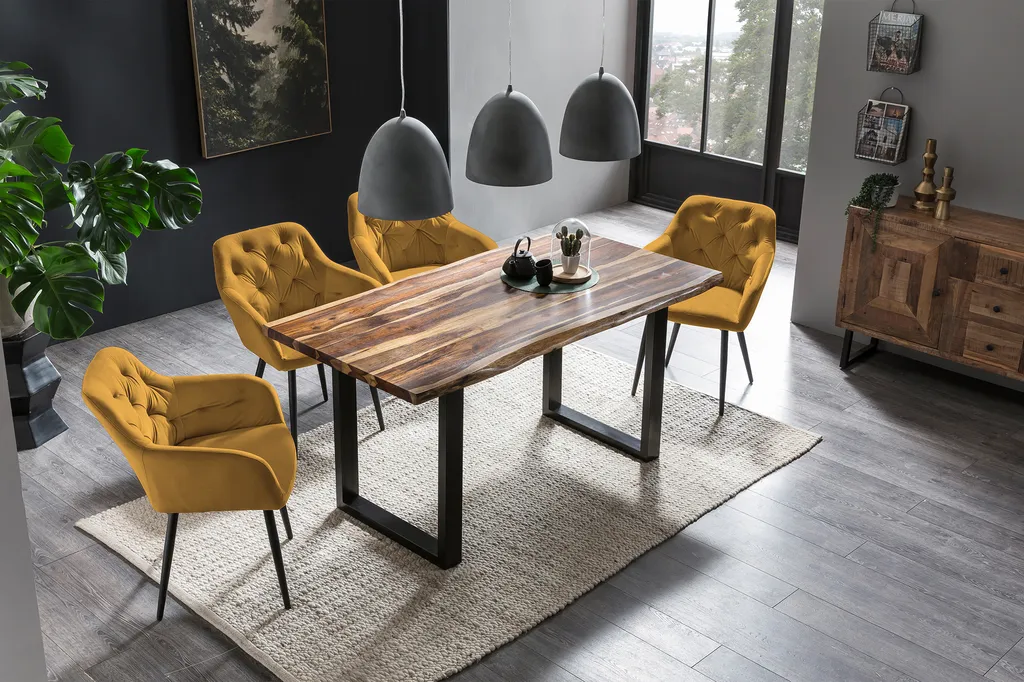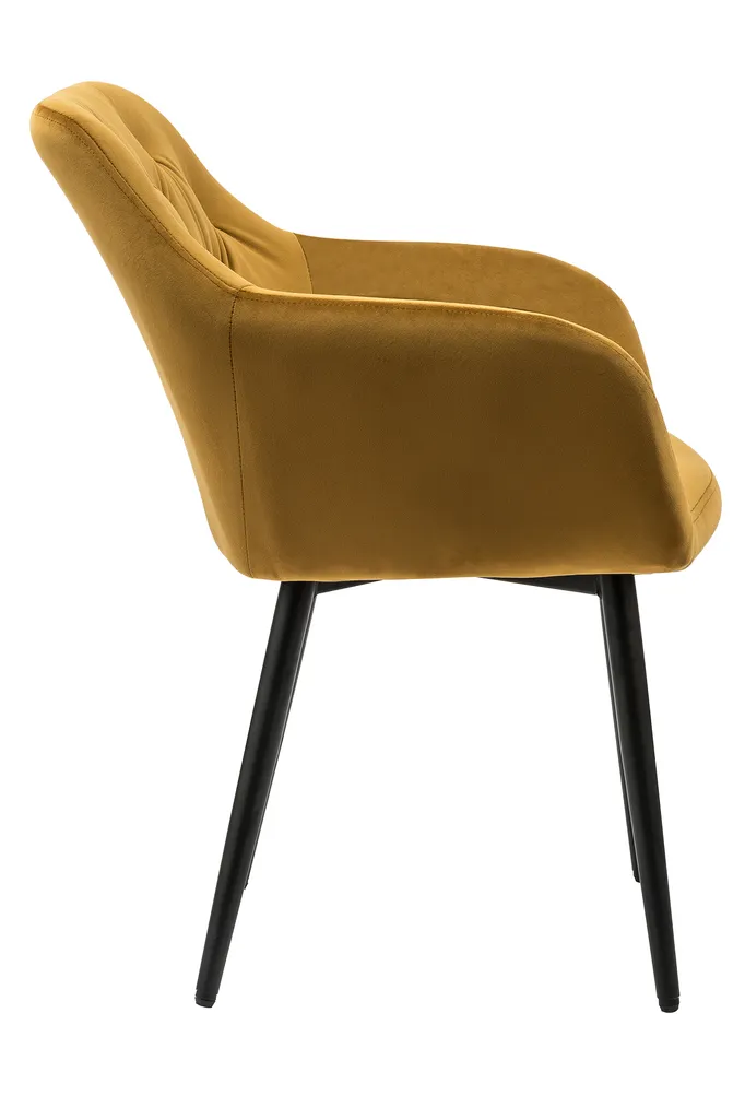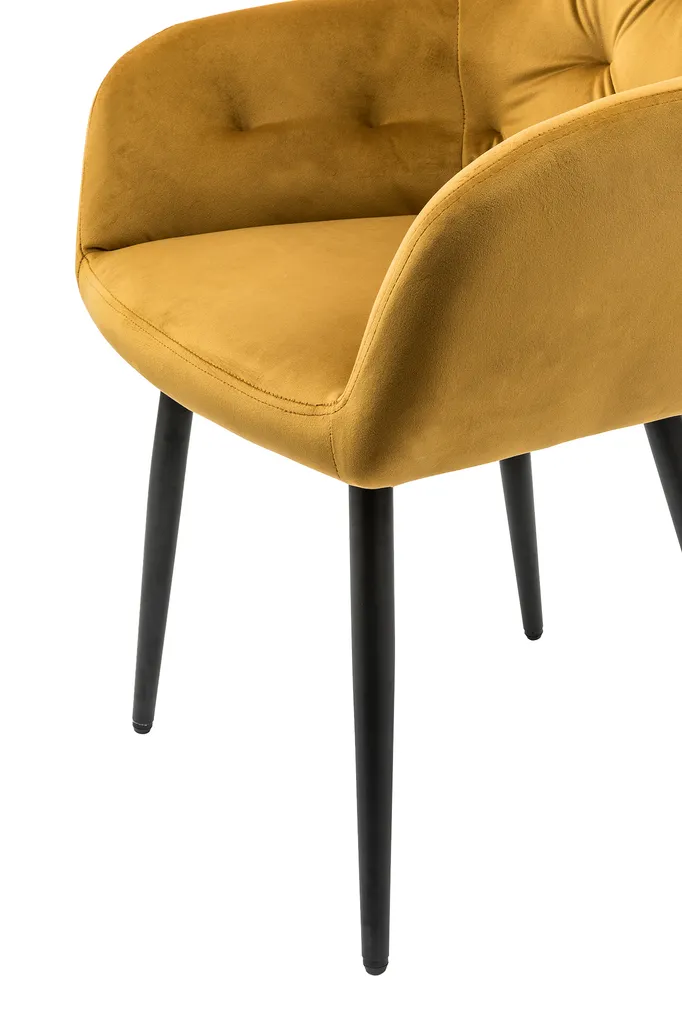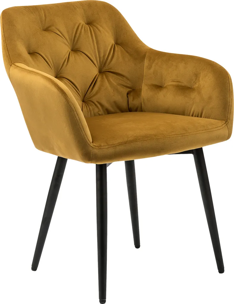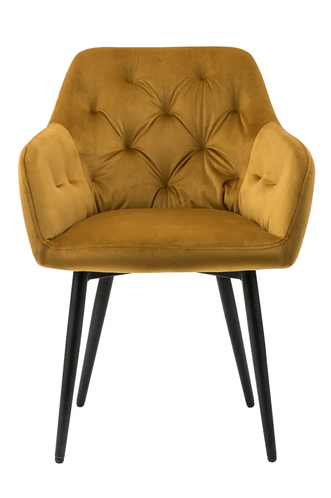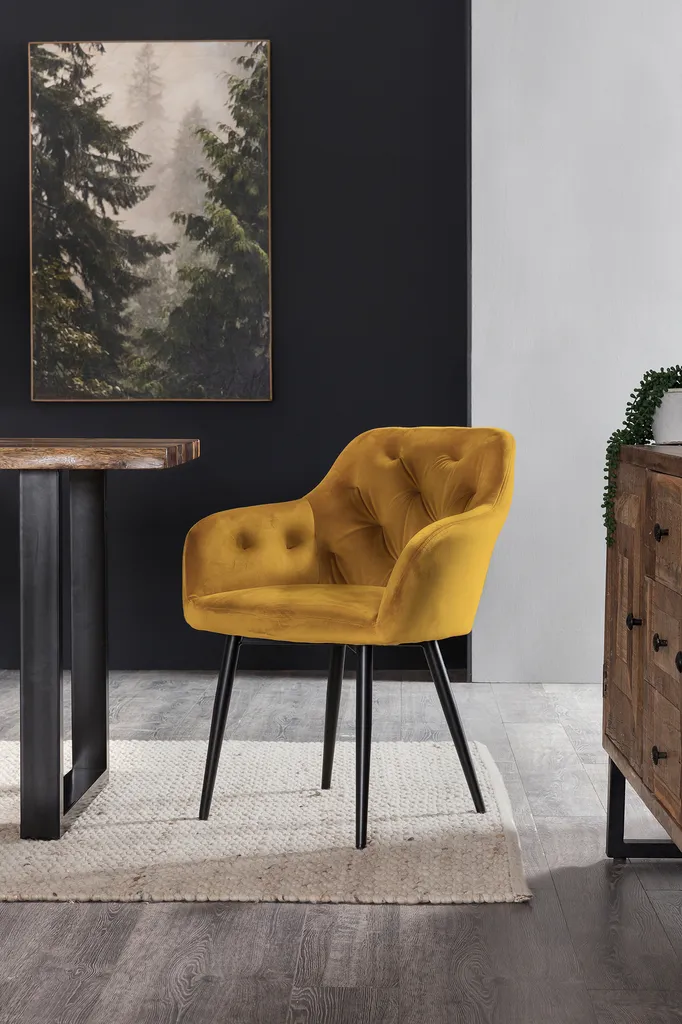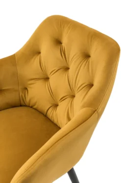 Der moderne Polsterstuhl besticht durch seinen Stoffbezug in Samt-Optik und überzeugt mit seiner Polsterung an Sitz- und Rückenfläche. Durch die bequeme Polsterung, die Rückenlehne und die Armlehnen entsteht ein angenehmer Sitzkomfort der Extraklasse. Das optische Highlight ist die Knopfheftung, welche sich über den inneren Rücken- und Armlehnbereich erstreckt und zu einem harmonischen Gesamtbild beiträgt.